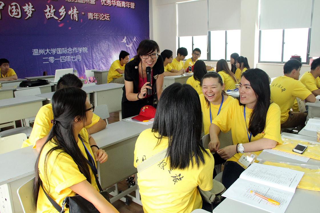 图为2014年优秀华裔青年营指导教师包含丽老师和营员共同探讨幸福观