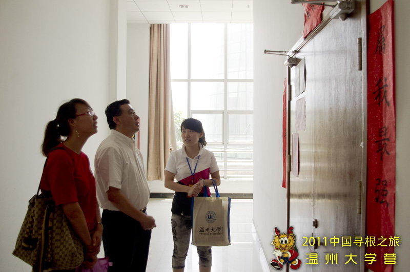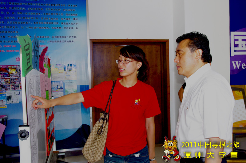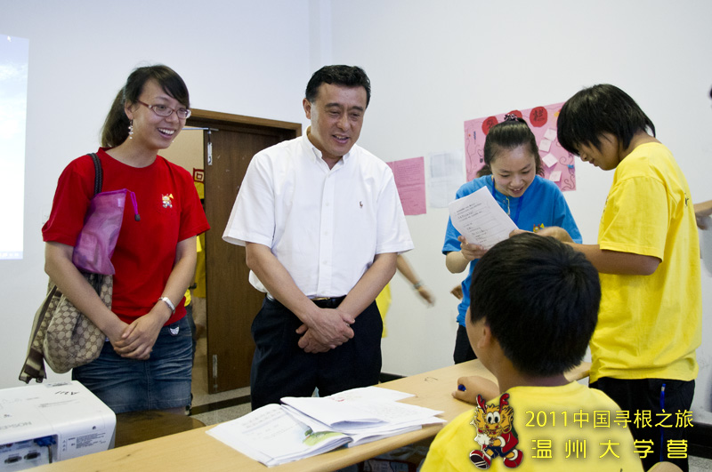 在夏令营指导老师包含丽老师的陪同下,薛校长首先视察了夏令营的课程安排和教学进度,对华文教育的工作落实和课程的合理安排表示了高度的赞扬和肯定。薛校长说:“华文教育,任重道远。我们要从每一件小事做起,让海外华裔青少年们对自己故乡有强烈的认同感和归宿感”。薛校长对温大分营除了开设中文基本课以外,还开设了书法课、剪纸课、温州民俗课、折纸课、地理课、民乐课、国画课、米塑课、瓯越文化知识课等多项富有中国传统文化和瓯越特色的课程表示了肯定,特别是对晨间、午间、晚间休息时候,播放传统儒家基础规范《弟子规》,要求营员学习并背诵表示了高度的赞扬。