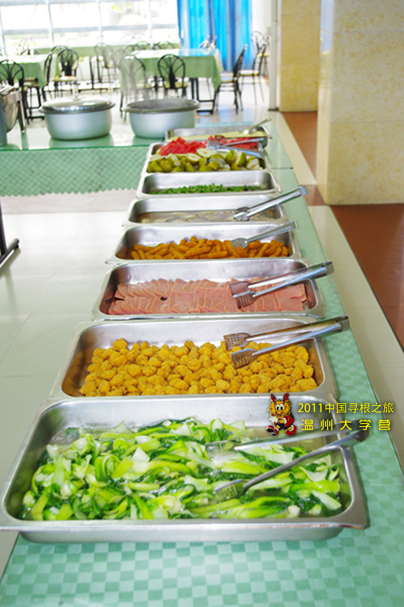 为了尽可能地照顾这些海外华裔的青少年们的饮食习惯,温大营地的工作人员独具匠心,采用以自助餐的形式,中西合璧。既有可口的中式菜肴,又有西式的薯条、鸡块。同时,餐厅还配置西瓜、哈密瓜、香瓜、梨、苹果等多种营养水果,荤素搭配,营养丰富。