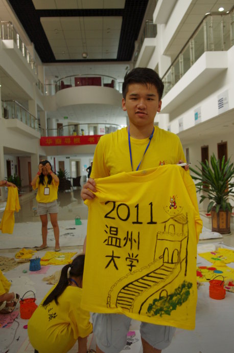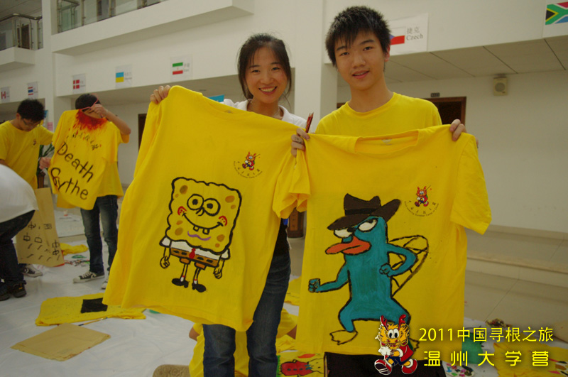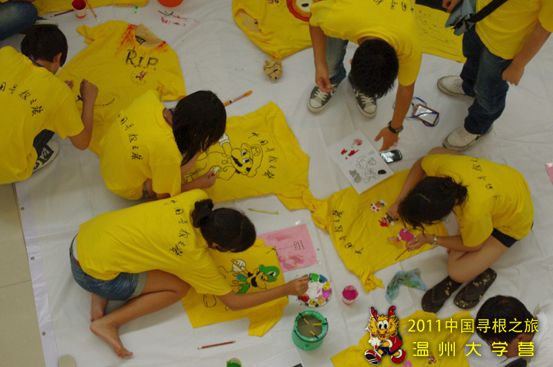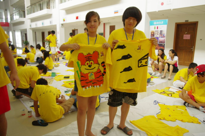 到了实践环节,营员们迫不及待地拿出自己的营服铺在地上,有的画了卡通兔子,有的画了中国娃娃,有的画了浴火重生的凤凰,还有的画了可爱的小猪或是海绵宝宝。大家拿起画笔,涂上颜料,一笔一画,尽情地在自己的“画纸”上创作着,充分发挥了自己的想象力和动手能力。最后,营员们完成好自己的作品后,纷纷留影纪念,并表示这是一次令人快乐难忘的经历。