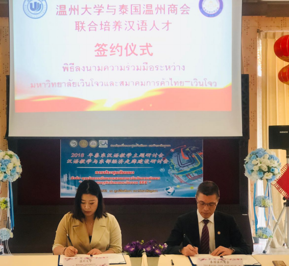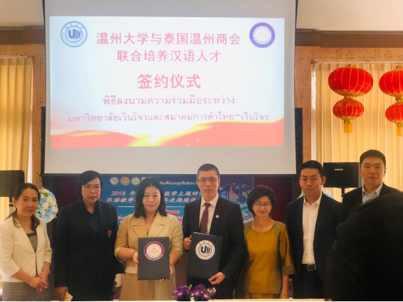 2018年12月21日,在泰国东方大学孔子学院内,3044am永利集团3044noc与泰国温州商会签署汉语人才培养协议,泰国温州商会委托3044am永利集团3044noc培养中资企业在泰国所需的汉语言人才,同时,泰国温州商会在泰国为3044am永利集团3044noc招收国际学生。双方通过合作,加强3044am永利集团3044noc与温州商会之间的人才培养关系、促进中泰两国国际教育发展。