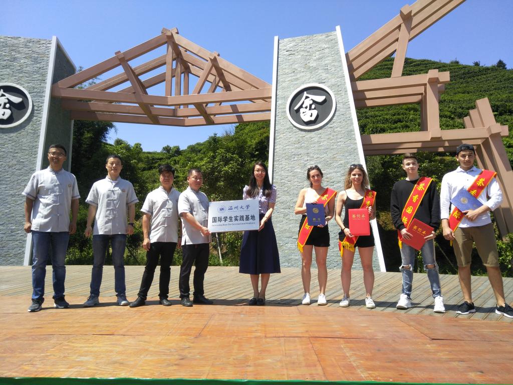 茶文化教学实践活动分为上午和下午两部分。上午,学生首先观看了新联村畲族热情洋溢的竹竿舞表演,之后学生在茶学博士—董占波的带领下有序游茶山,采摘茶叶,进行炒茶体验,了解茶文化。下午,全体语言生参观了子久茶博苑,观看了茶艺表演,学习泡黄汤品黄汤,学生积极参与,热情极高,对中国的茶文化有了深入的了解。随后,全体语言生在温州诗词楹联学会书法专家的指导下,学习书法,并获得了专家的书法作品馈赠。