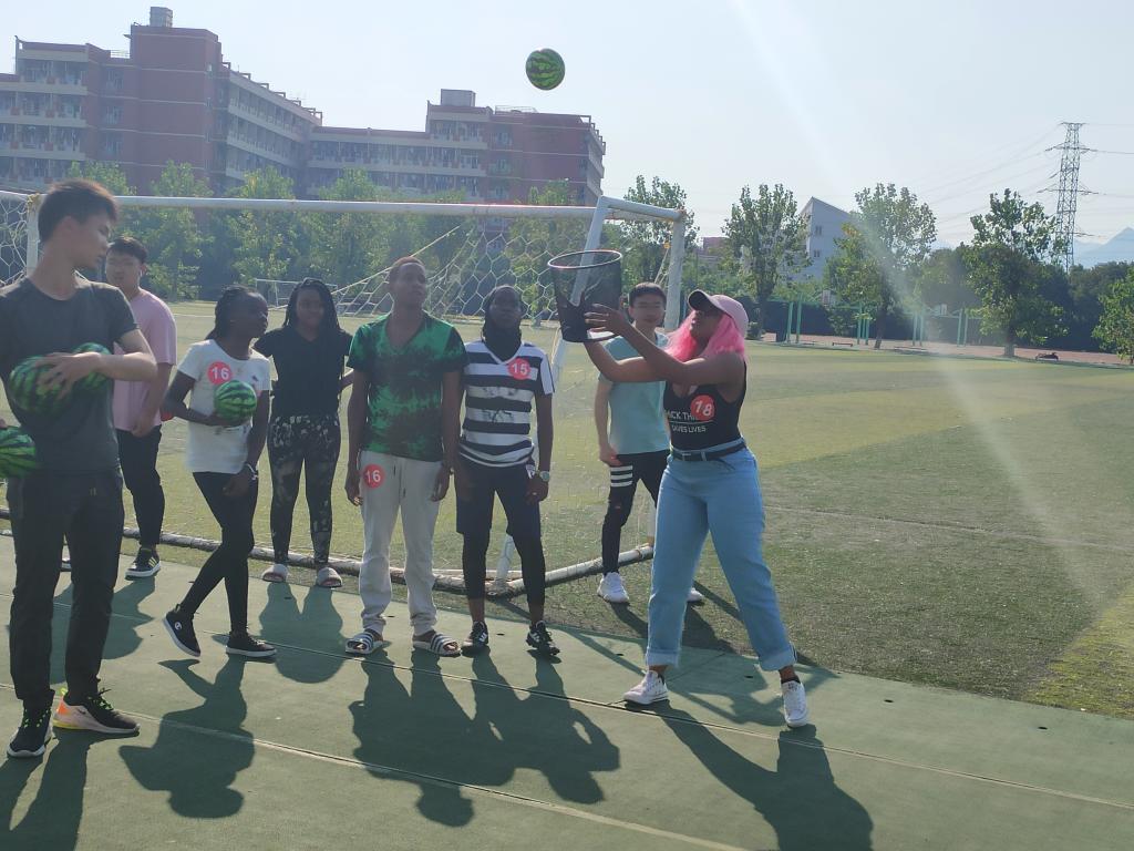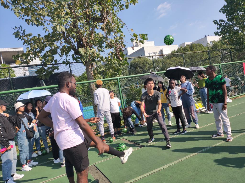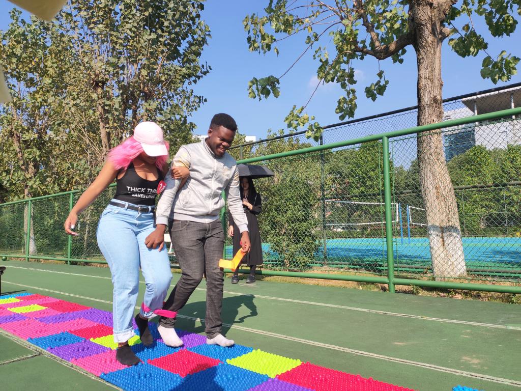 此次趣味运动会项目内容丰富,其中趾压板两人三足、乒乓球水接力和皮球术三个闯关计时项目最受师生欢迎。在两人三足比赛时,选手们个个做好准备,小心翼翼地走过赛道,忍受着脚底板的疼痛齐心协力走向终点。在乒乓球水接力环节,学生们都耐心地端着手里的纸杯,生怕乒乓球被摇晃出来。在皮球术环节还特别设置了合作赛,两两选手组合参赛,排名靠前的队伍可获得时间奖励。国际学生与中国学生团结协作,配合队友调整好自己的速度,尽量减少比赛时间以获得优胜。