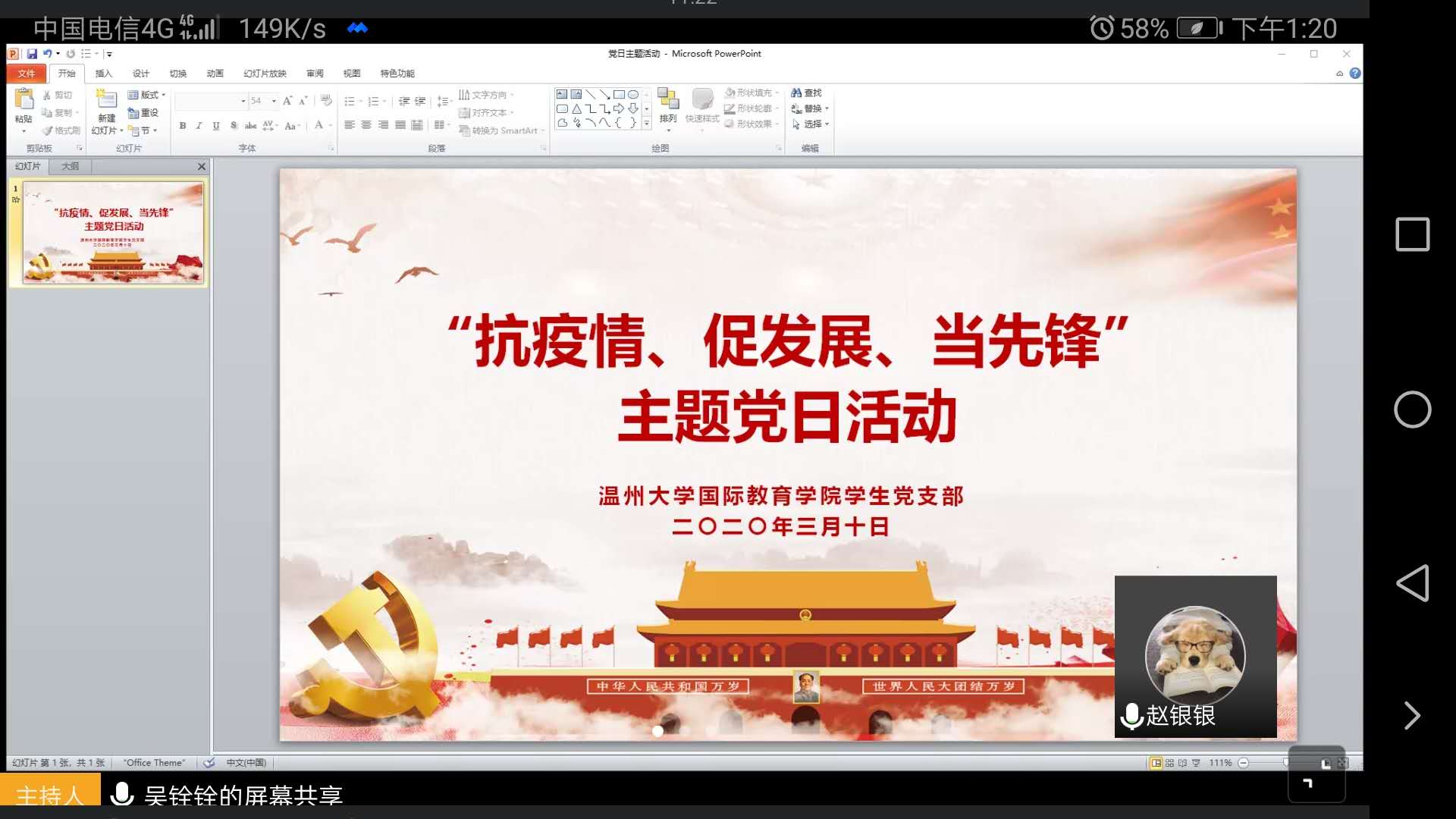 疫情之下,虽难以像往常一样面对面开展党日活动,但永利集团官网学生党支部也积极创新,采用线上视频会议形式开展了新学期的主题党日活动。支部全体学生党日如期参加活动,由学生党支部书记吴铨铨主持。