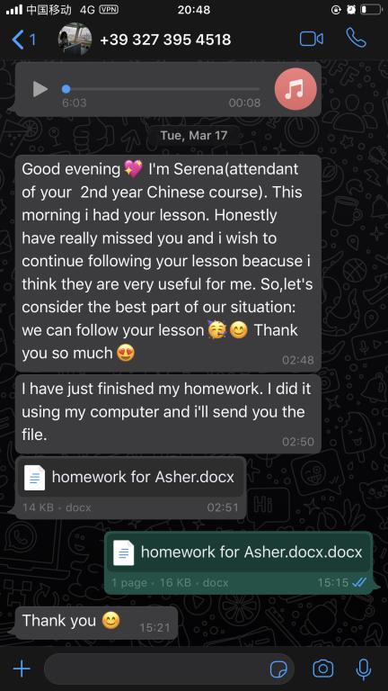 每一周,张珉璐都会精心把每个年级的两小时课程视频录制好,与音频、ppt、练习作业及一些额外的针对不同级别HSK的练习发送给意大利老师,意大利老师再上传至3044am永利集团3044noc意大利分校的学习平台,学生通过平台下载视频和学习资料进行学习。