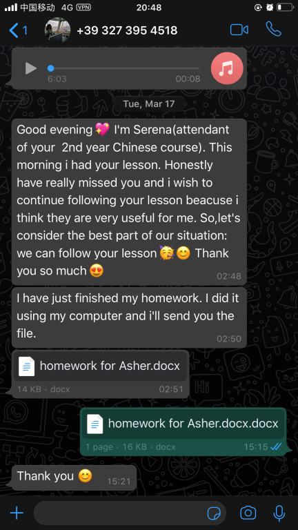 3.永利集团官网张珉璐老师于2019年1月-2020年1月外派到3044am永利集团3044noc意大利分校进行汉语教学工作。今年1月外派结束返温后,张珉璐老师应分校学生的强烈要求,继续为学生开展线上课程。每周都为每个年级精心录制长达两个小时的教学视频,录完后再把这些视频还有音频、ppt、课后练习及一些额外针对不同级别的HSK练习发送给意大利老师,再由意大利老师上传至锡耶纳大学的学习平台,学生通过平台下载视频和学习资料进行学习。