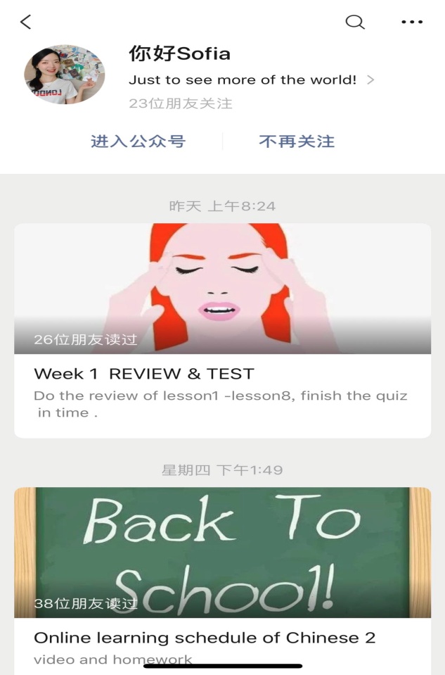 2.《汉语(二)》课程三位任课老师徐丽丽、金碧、吴晓菲,在采用录课教学的同时还开设了微信公众号,用于实时发布教学信息,如:录课视频、课后作业、文化常识等。旨在让目前由于疫情散落在世界各地的我校国际学生不仅能学习汉语,也能深入感受中国文化。同时,考虑到汉语教学的特殊性,汉语老师们通过问卷星安排每单元小测,在微信群实时答疑,通过课程阶段性问卷,关注学生学习效果。