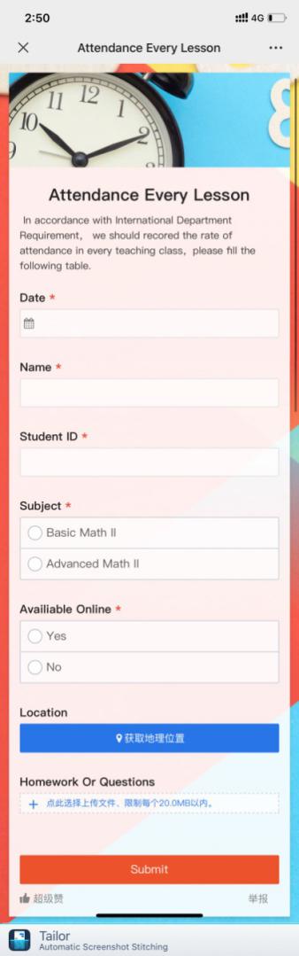 1.《高等数学(二)》、《基础数学(二)》课程任课老师李毅,为学生们设计了签到小程序,可以自动获取学生地理位置,便于实时掌握学生的位置。除此之外,教师们还采用了符合国际学生使用习惯Zoom作为主要教学平台,结合微信作为签到、发放通知以及留言答疑的平台。