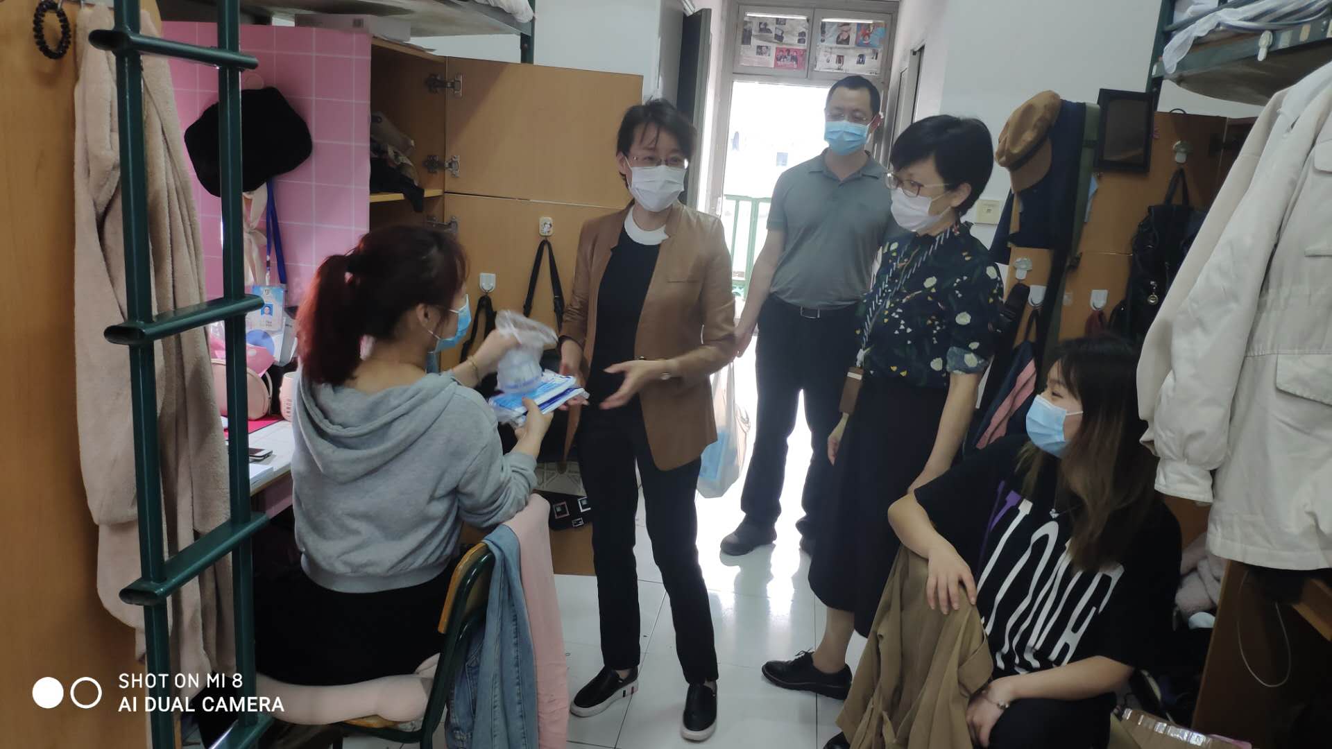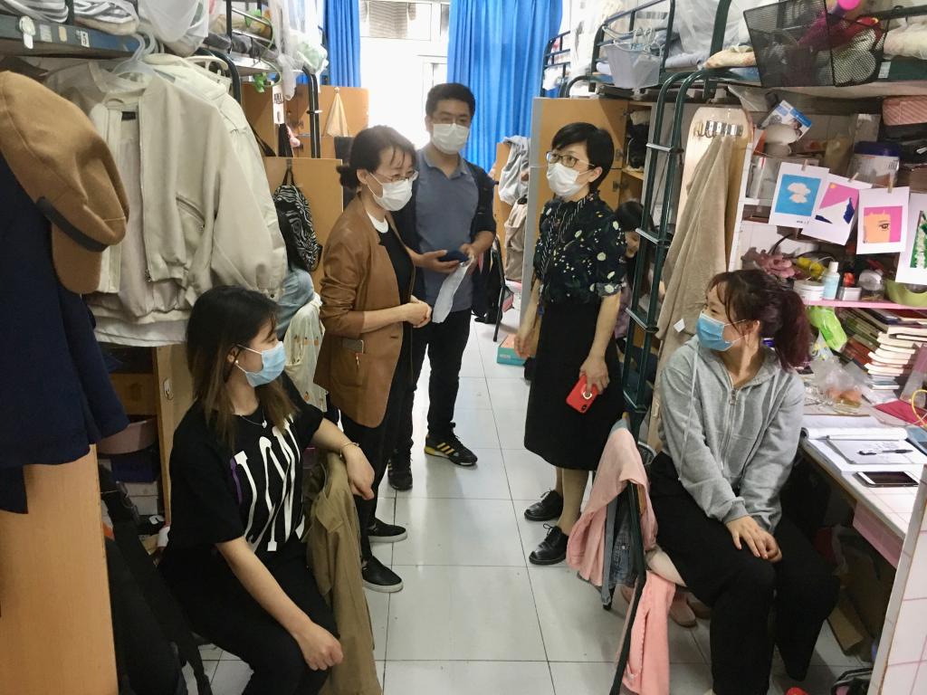 张雪萍副书记亲切慰问各位同学身体状态,了解同学们防疫物品准备情况,并为每个寝室送上必要的消毒用品。她提醒同学们特殊时期更要预防感冒。希望同学们生活上互相关心,互相理解。