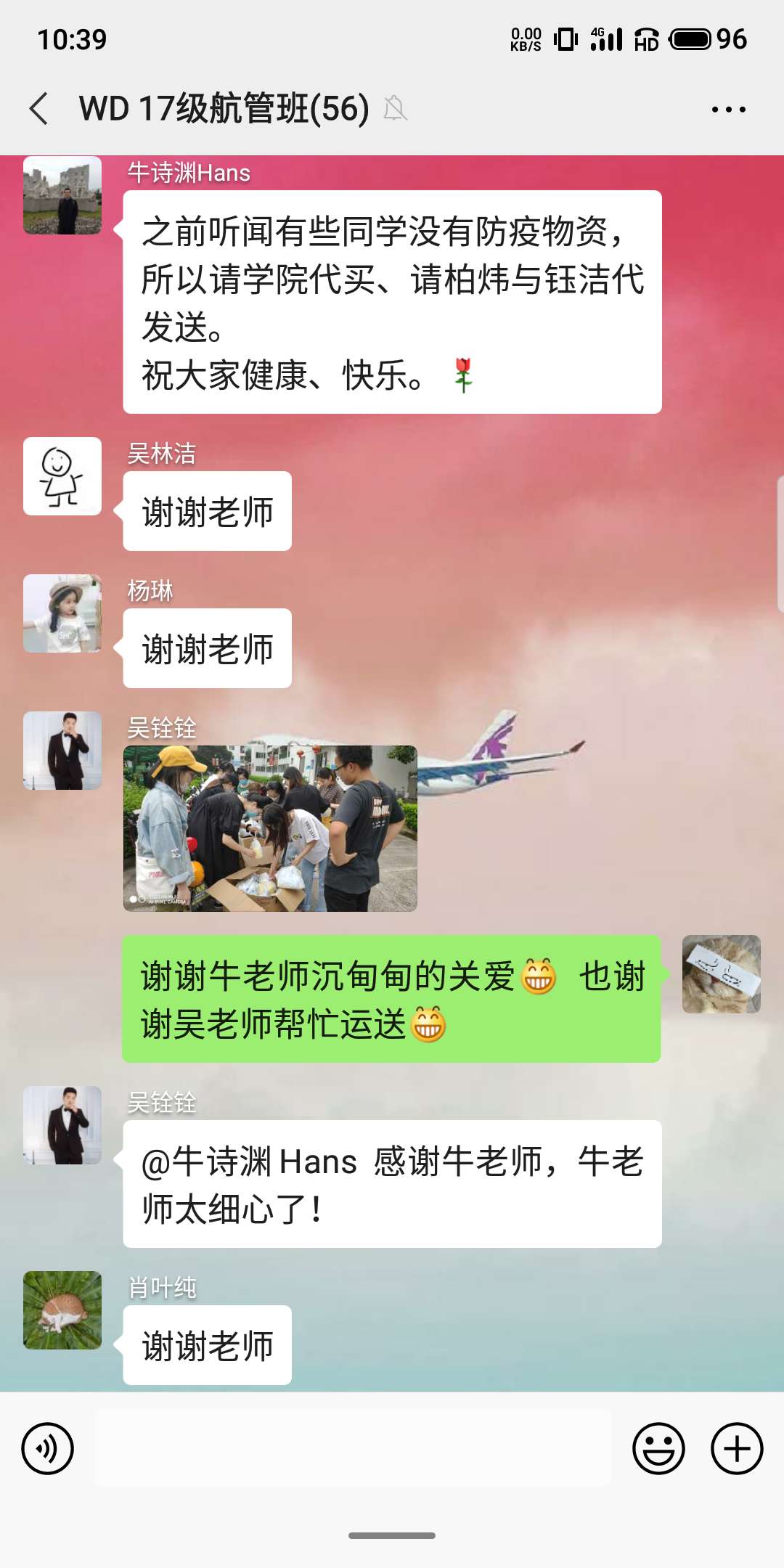 牛诗渊副教授是台籍教师,由于受疫情影响,不能前来学校授课。身在台湾,隔着海峡,牛老师心系远在大陆的学生,经常与学生保持联系,问寒问暖,还特地自出经费委托学院给航空管理专业的每位学生准备了一套防疫用品,让人感动不已。