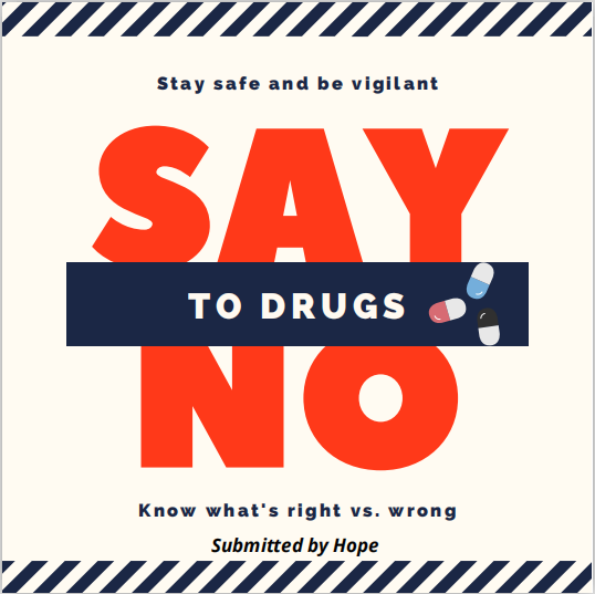 一等奖获得者SALUM FAHMI HAROUB同学说,在他的家乡有很多家人和朋友因为毒品失去了生命,失去了未来,这一方面使他害怕毒品,另一方面促使他鼓起勇气,运用自己绘画的特长来制作警示海报,提醒人们远离毒品。“我觉得对于学生来说,毒品就像是慢性毒药,不仅可以导致死亡还会摧毁一个家庭。因此我们要远离毒品,因为优秀的学生需要健康的心灵,而健康的心灵是没有毒品的心灵。”