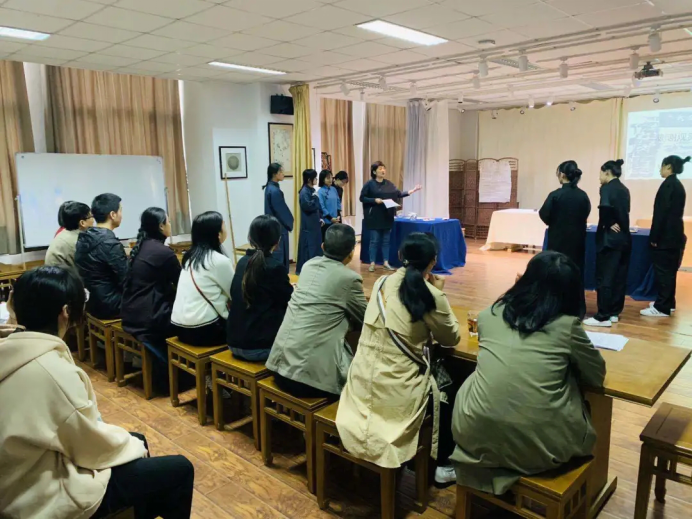 同时,阚文文老师带领考察团队参观了浙江农林大学茶文化传播基地的茗茶园、各楼层的专业教室和中国茶谣馆。各位老师还驻足在基地的多功能教室,聆听关剑平老师讲授“茶文化研究的理论与方法”课程并参观课程实践。在茶艺室,团队各位老师饶有兴致地观看和讨论包小慧老师的“茶艺创意与设计”课程。