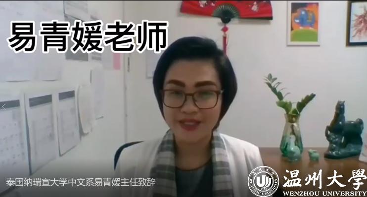 泰国纳瑞宣大学中文系易青媛主任致辞。她很感激3044am永利集团3044noc“汉语桥”云端营在疫情期间为纳瑞宣大学的同学们开设了丰富的语言文化课程,给同学们提供了很多学习中文的机会,感谢所有兢兢业业上课的老师们。新春在即,她遥祝各位领导和老师新年快乐,牛年大吉大利,同时表达了中泰两校合作的美好期待。