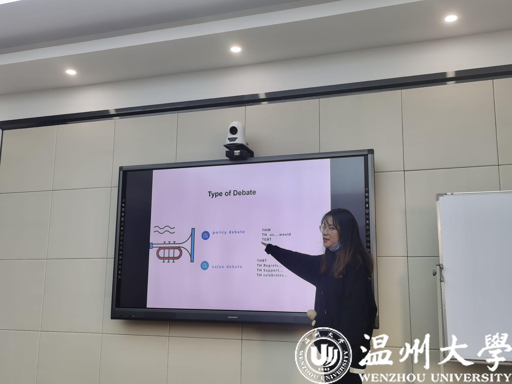 2021级汉硕研究生陈凤同学作为第三期主讲人,为我们分享了“英语辩论”的相关知识。陈凤同学讲解了英语辩论赛中辩手的职责、英语辩论的主要类型、英语辩论的主要内容以及中英辩论赛的异同。介绍结束后,陈风同学带领与会同学进行了两场英语辩论实战演练。演练过程中,双方辩手斗志高昂,难决胜负,为我们呈现了一场激烈的头脑风暴!