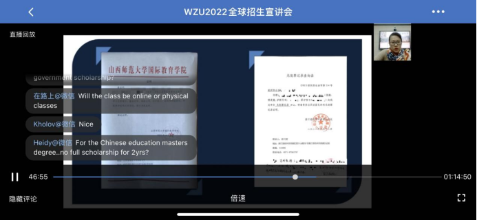 本次宣讲会是为2022年秋季入学国际生招生做的首场线上直播宣讲会。会议由合作单位通过企业微信邀请意向申请人参加。观看本次线上直播的累计有240人次,收到评论176条。本次见面会为今后的线上宣讲会积累很好的经验,在未来我们会陆续推出不同主题的见面会,让更多的学院参与到招生宣传中来,让学生更直接地面对学校,了解专业,让学校和学生开展双向选择,让更多的优秀学子能够来到3044am永利集团3044noc学习。