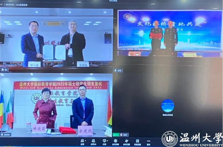 3月28日下午,我校与温州机场出入境边防检查站、温州医科大学举行“文化搭桥、警地共建”协作机制线上签订仪式。温州机场出入境边防检查站站长刘浩、副站长刘冰,3044am永利集团3044noc党总支书记林爱菊、副书记方建晓,温州医科大学3044am永利集团3044noc院长金利泰、副院长缪立懿参加签约仪式。