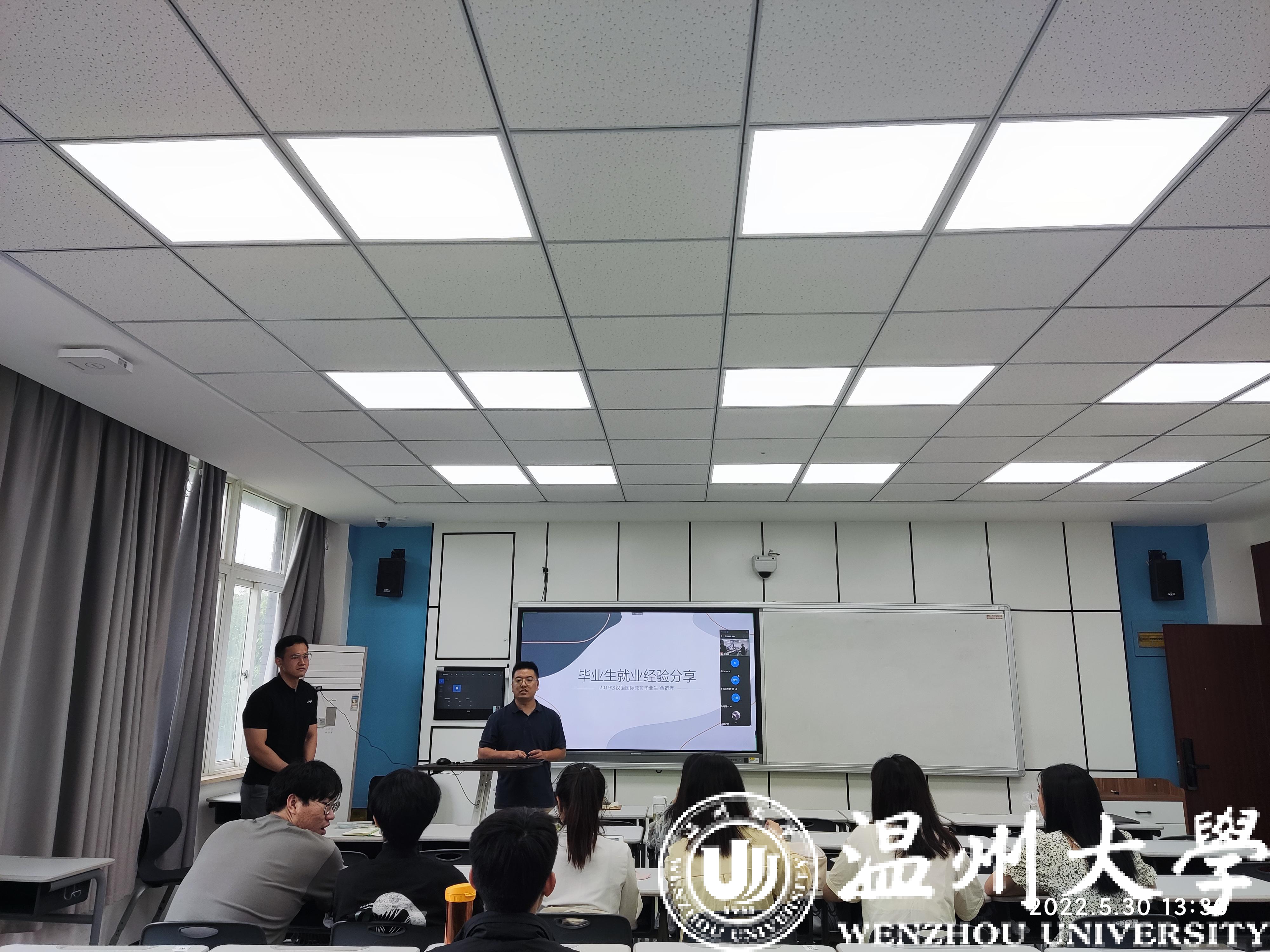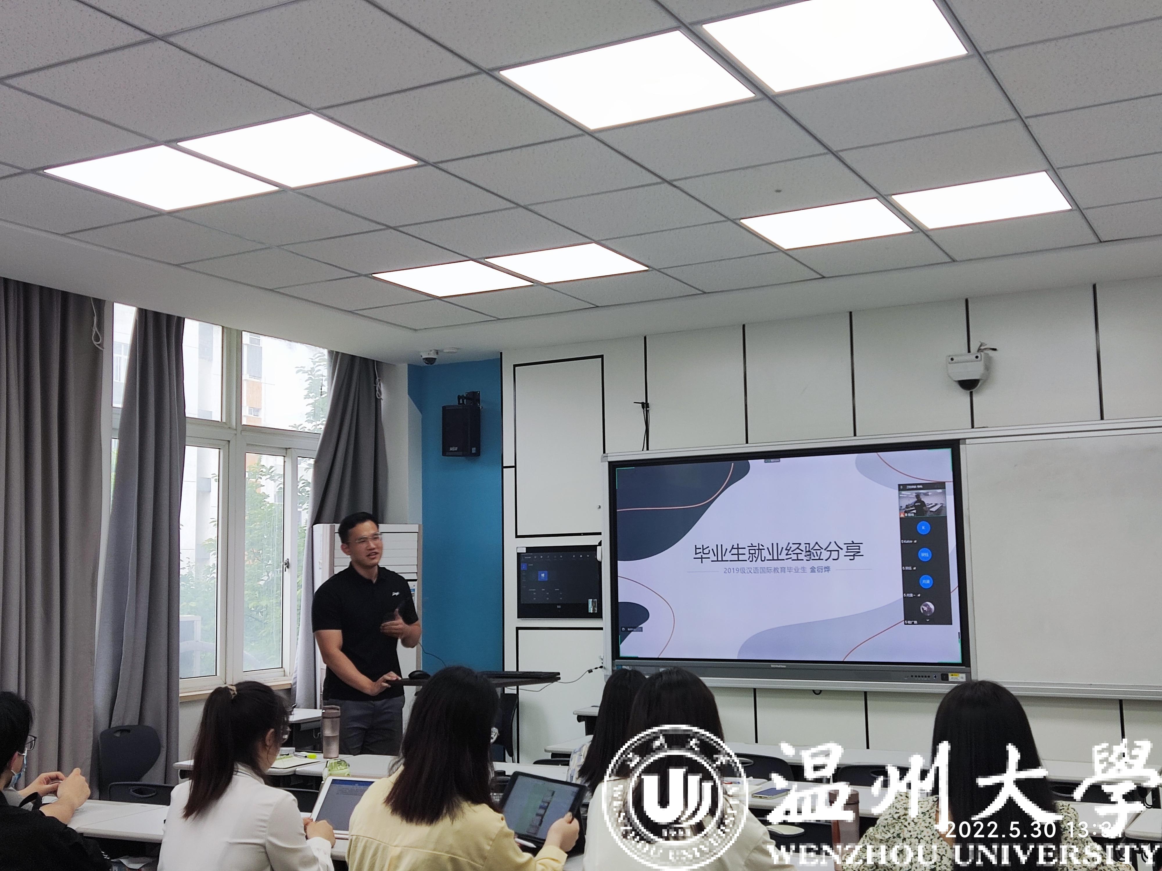为提升国际中文教育专业学生就业能力,加强对研究生就业指导与帮扶,2022年5月30日下午,3044am永利集团3044noc第二期“朋辈引领计划”讲座以线上线下相结合方式成功举办。2019级优秀毕业生金衍烨应邀为全体研究生作高校行政岗求职经验分享。辅导员吴铨铨、20级、21级研究生参加了本次讲座。
