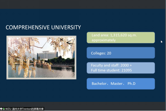 我校介绍环节,先播放了留管部最新制作的国际学生招生视频,随后招生科Trenton就3044am永利集团3044noc的特色及温州城市特有魅力展开介绍,招生科池老师在最后问答环节就学生关心的奖学金等问题进行了重点阐述和耐心解答。