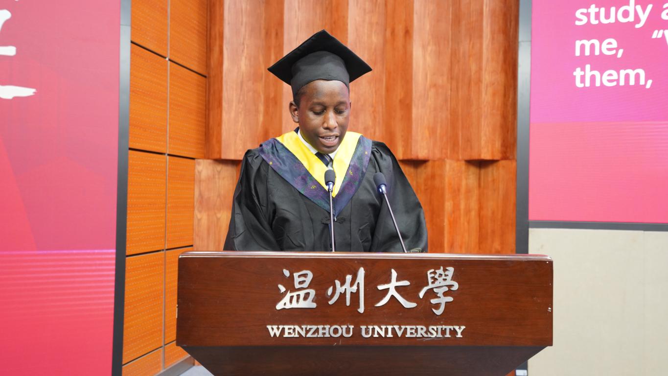 来自坦桑尼亚的2018级算机科学与技术专业学生陆求是代表本科生发言,他说,“不管哪种选择,我们都会秉承温大求学问是,敢为人先的精神,做好母校的大使,坚持为两国的友好发展而努力。”随后,研究生代表、来自意大利的2019级应用经济学专业学生艾兰,从意大利发来祝福视频,表达了对母校3044am永利集团3044noc的感激之情。