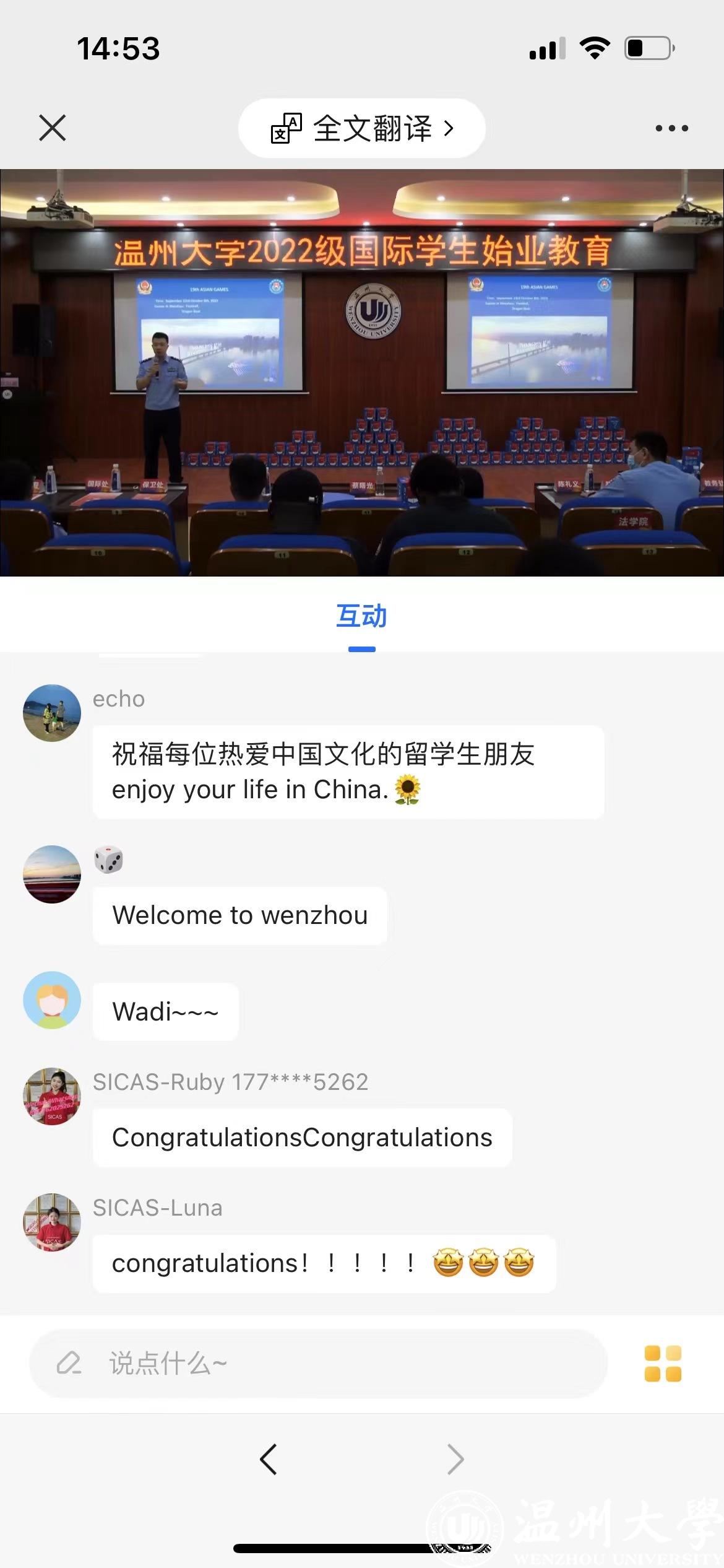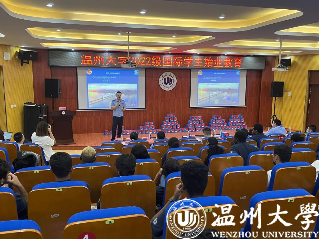 为帮助2022级国际新生全方位了解国情、校情,以全新面貌和昂扬姿态开启留学温大生活。9月15日,为期一周的2022级新生始业教育活动在开学典礼后拉开序幕。温州市出入境管理局欧阳超警官,瓯海区出入境管理大队麻晓军、陈礼义、梁佳莉警官,茶山派出所民警陈海敏,校图书馆吴凤仙,3044am永利集团3044noc相关科室领导老师,全体国际学生参加了新生始业教育。