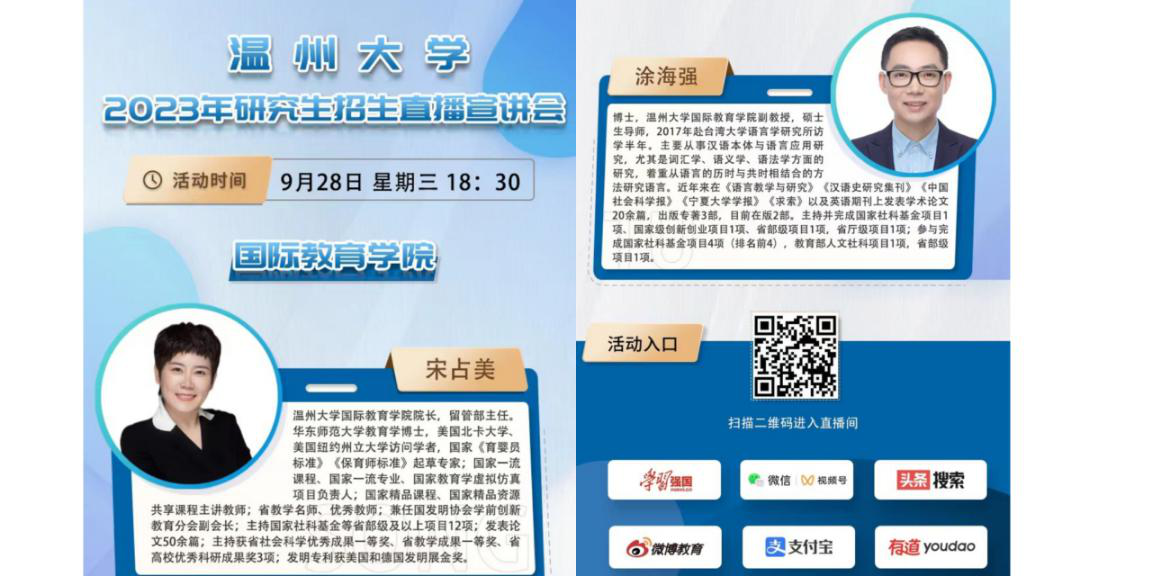 9月28日下午18:30,永利集团官网成功地举行了2023年研究生招生直播宣讲会。3044am永利集团3044noc院长(留管部主任)宋占美、硕士生导师涂海强出席了本次宣讲会。宣讲会采用线上直播方式进行,直播活动通过中国教育在线考研频道、掌上考研公众号、全国研究生招生线上咨询群等中国教育在线官方平台全面推广,吸引了大量考研学子和家长观看,为永利集团官网2023年汉硕招生工作奠定了良好基础。
