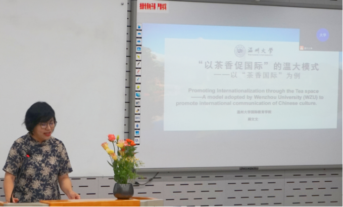 永利集团官网“中华文化传统文化工作坊”主持人阚文文副教授作了“以茶香促国际的温大模式”的主题发言。多年来她深度提炼中国文化中的思想内核,选择“茶”为中国文化的标志性符号,积极利用“茶香国际:中华文化传播基地”平台,开发针对不同受众的线上线下茶文化系列课程和讲座、以及校园节气茶会、多元国际交流互动等各种形式进行深入又广泛的实践,用世界人民喜爱和接受的中国茶文化来讲中国故事,传递中国声音,探索出一套行之有效的中国文化国际传播的方法和策略,打造出了独具特色的“茶香国际”中华文化国际传播的新模式。