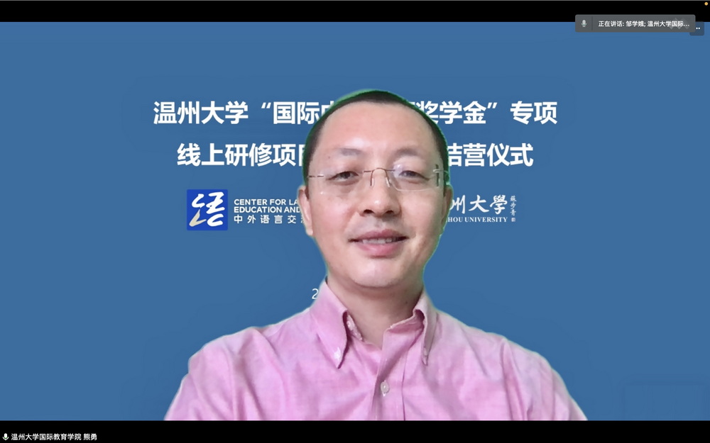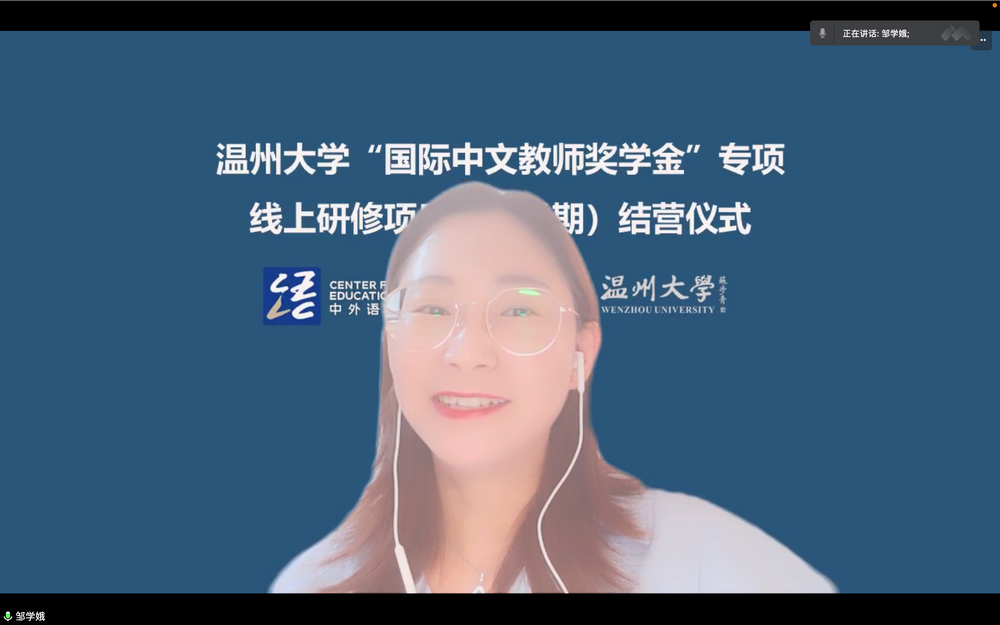 然后,由3044am永利集团3044noc教师代表邹学娥老师讲话。她对全体学员表示祝贺和感谢,认为本次线上学习营的圆满成功离不开教师和学生之间的相互支持,深感教学过程中见证了学生们对学习汉语的热情和坚持,教师们也为此深受感动,并将这份感动化为教学中的热情与耐心。最后,她期待大家能来中国留学,能来3044am永利集团3044noc看看。