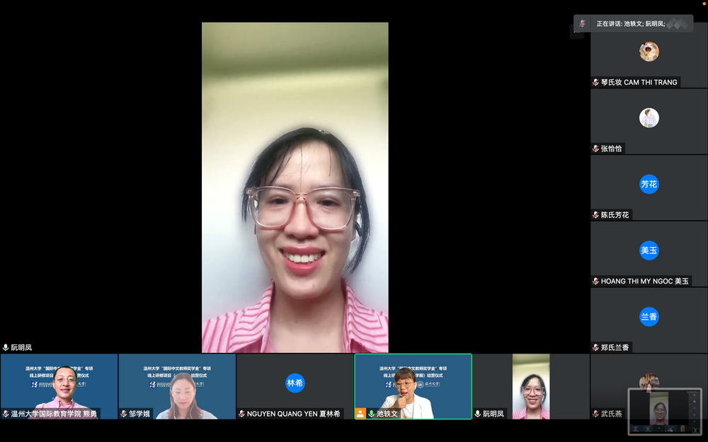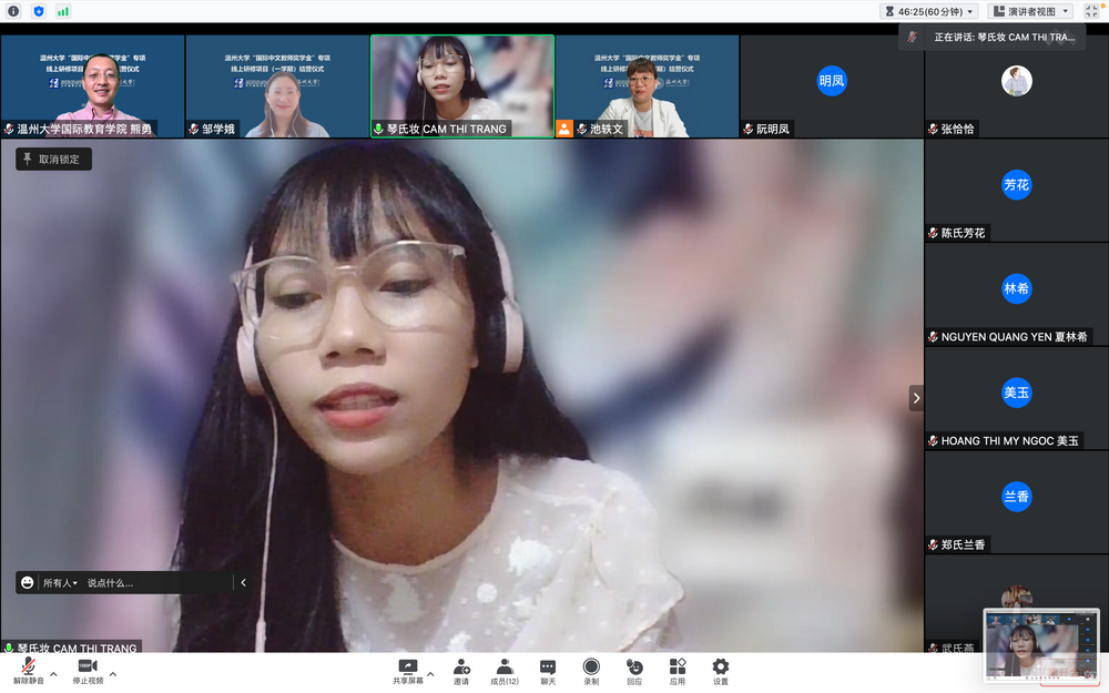 接着,在学员代表发言环节中,越南学生代表阮明凤感慨这是一次非常有意义的经历,让她受益匪浅。通过一学期的学习,她不仅学习了听说读写一系列汉语技能,还对中国文化有了更深的理解和认识,除了线上课的学习,她还会通过看中国的电视剧和音乐学习汉语。