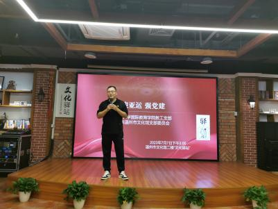 为推进学习贯彻习近平新时代中国特色社会主义思想主题教育走深走实,积极响应中共温州市委组织部开展“红七月·服务月”活动的倡议,7月7日,3044am永利集团3044noc教工党支部组织开展了“迎亚运分享会暨与温州市文化馆党支部党建联建活动”。此次活动于温州市文化馆二楼“文化驿站”举行,3044am永利集团3044noc教工支部党员、温州市文化馆党支部党员、温州市文化馆青年理论学习社成员等参与了活动。活动围绕“学思想、当先锋、促践行”的主题,结合亚运会保障工作等大事要事,学习传达近期习近平总书记在文化传承发展座谈会上的重要讲话精神。