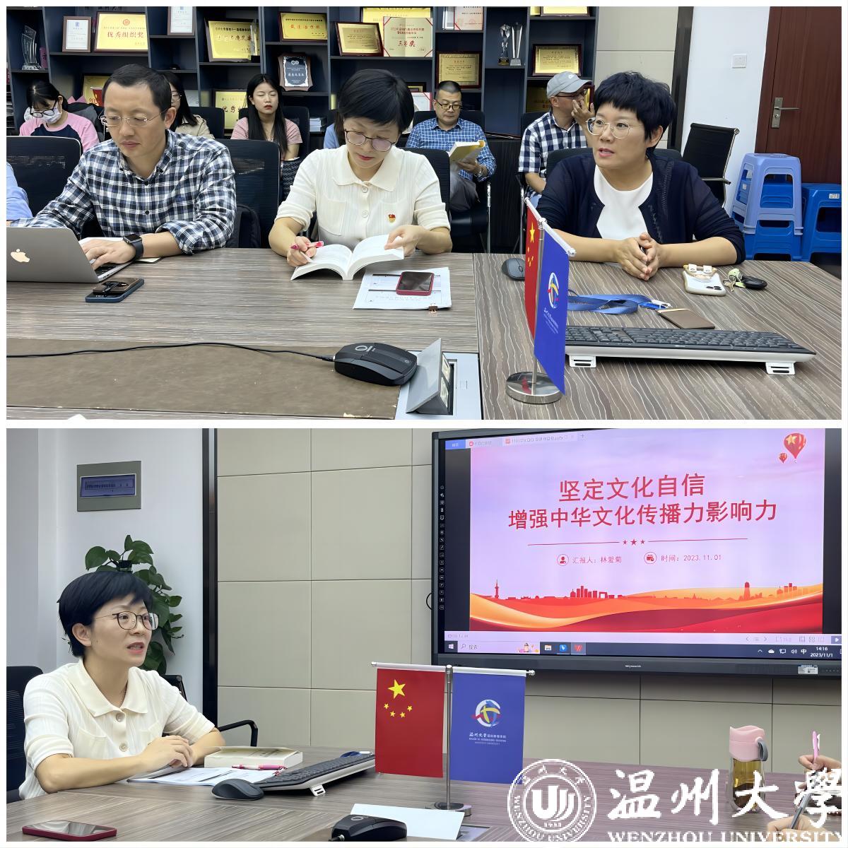 林爱菊书记以《坚定文化自信 增强中华文化传播力影响力》为题讲授专题党课。林书记以习近平总书记关于文化自信及讲好中国故事的指示精神、重要论述为立足点,深刻分析了推进文化自信自强,夯实传播中华文化的思想根基,同时也全面分析了中华文化的精神标识和文化精髓,接着林书记结合学院实际,指出了提高传播效能的实施路径。她希望全体师生用好全媒体手段,让中华文化故事“活起来”、发挥国际学生作用,让中华文化故事“火起来”、打造高素质队伍,让中华文化故事“传起来”。