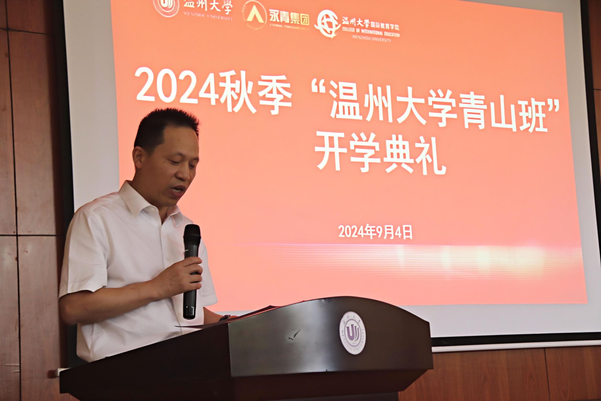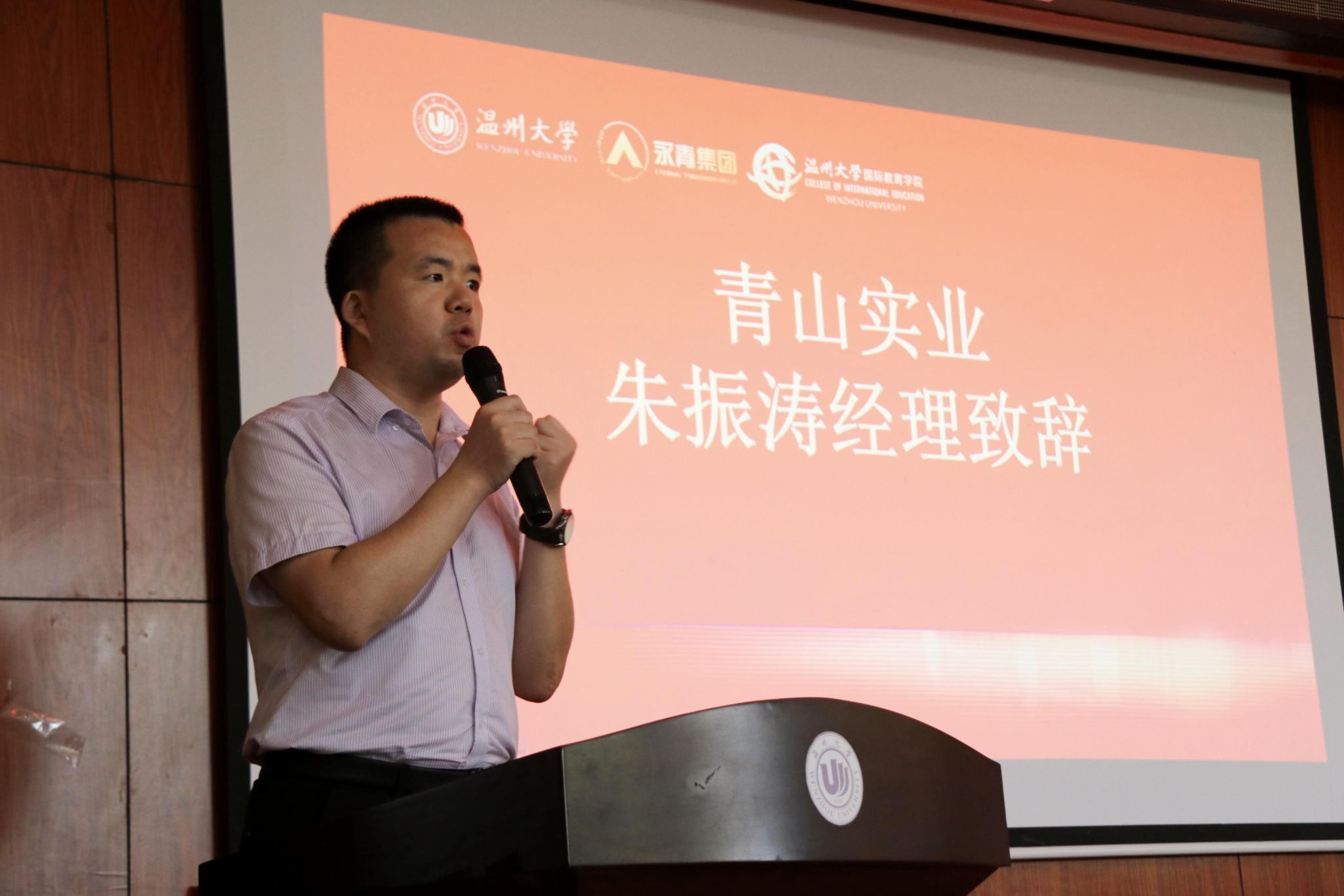 青山实业永青集团福建代表处综合管理部朱振涛经理作为企业代表发言。他表示公司将全力保障同学们在温大的学习生活,希望同学们尽快适应学习生活、掌握学习方法,实现既定学习目标。