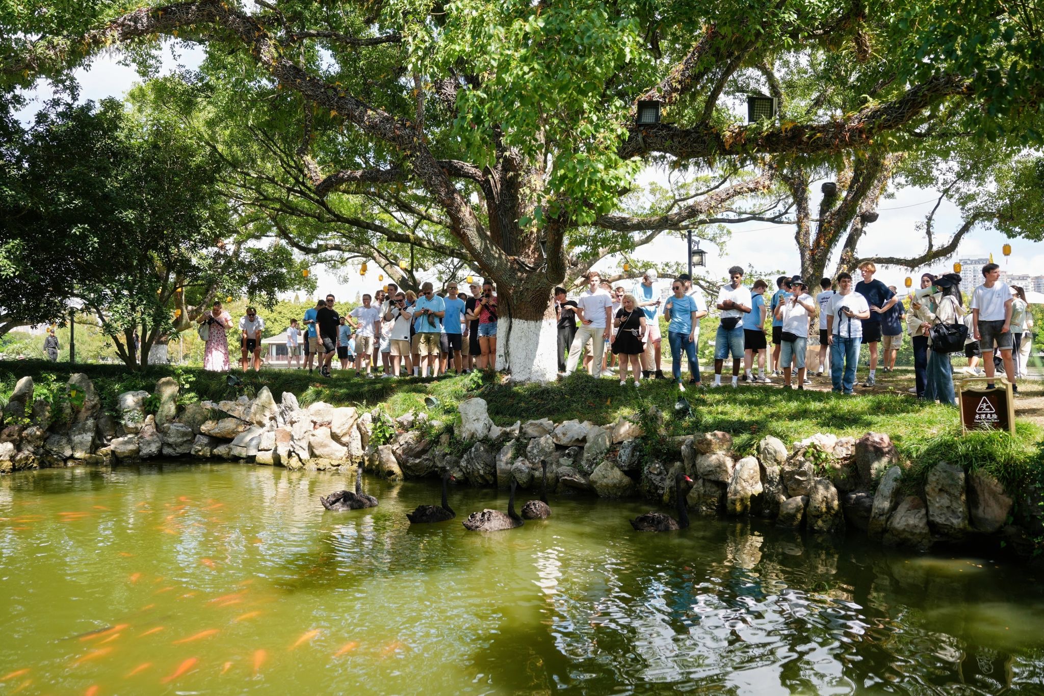 上午第一站是瓯越大地的标志性胜景——江心屿。这座江心小岛犹如一颗绿色的明珠,静静镶嵌在瓯江之中,在讲解员的详细解说下,德国青年学生们漫步于古塔、古寺之间,感受着温州的自然美景与历史文化的沉淀。他们聆听着江心屿的历史故事,仿佛穿越了时空,与古人对话,体验了一次心灵的洗礼。