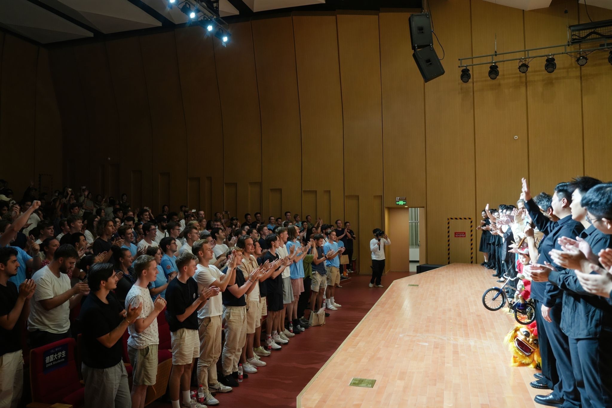 中德青年艺术之夜更是高潮迭起。民乐合奏《风入松》以悠扬的旋律拉开了艺术之夜的序幕,仿佛将人们带入了一幅宁静的山水画卷,展现出中国传统文化的独特魅力。平阳木偶戏《舞狮》和《车技》以其精湛的技艺和生动的表演,赢得了观众们的阵阵喝彩。浙南古琴《平沙落雁》余音袅袅,让人陶醉在古典音乐的深邃魅力之中。女子独舞《春闺梦》优美动人,尽显中国传统文化的婉约之美。男声独唱《心脏》激情澎湃,让现场观众们感受到了音乐的强大力量。琵琶独奏《十面埋伏》气势磅礴,仿佛把人们带回到了古代战场。还有德国学生带来的诗歌朗诵《Erlkǒnig》,让人们感受到了德国文学的别样魅力。钢琴独奏《兰花花》《看秧歌》和《Auf die Freundschaft zwischen Deutschland und China》,以及《Waltz in A minor》,则以优美的旋律展现了中德两国音乐的独特魅力。二胡与钢琴《战马奔腾》以激昂的节奏,展现了中德两国青年的活力与激情。最后,中德大学生互动节目《友谊地久天长》将现场气氛推向了高潮,大家手牵手,共同唱响这首经典的歌曲,表达了对中德友谊的美好祝愿。