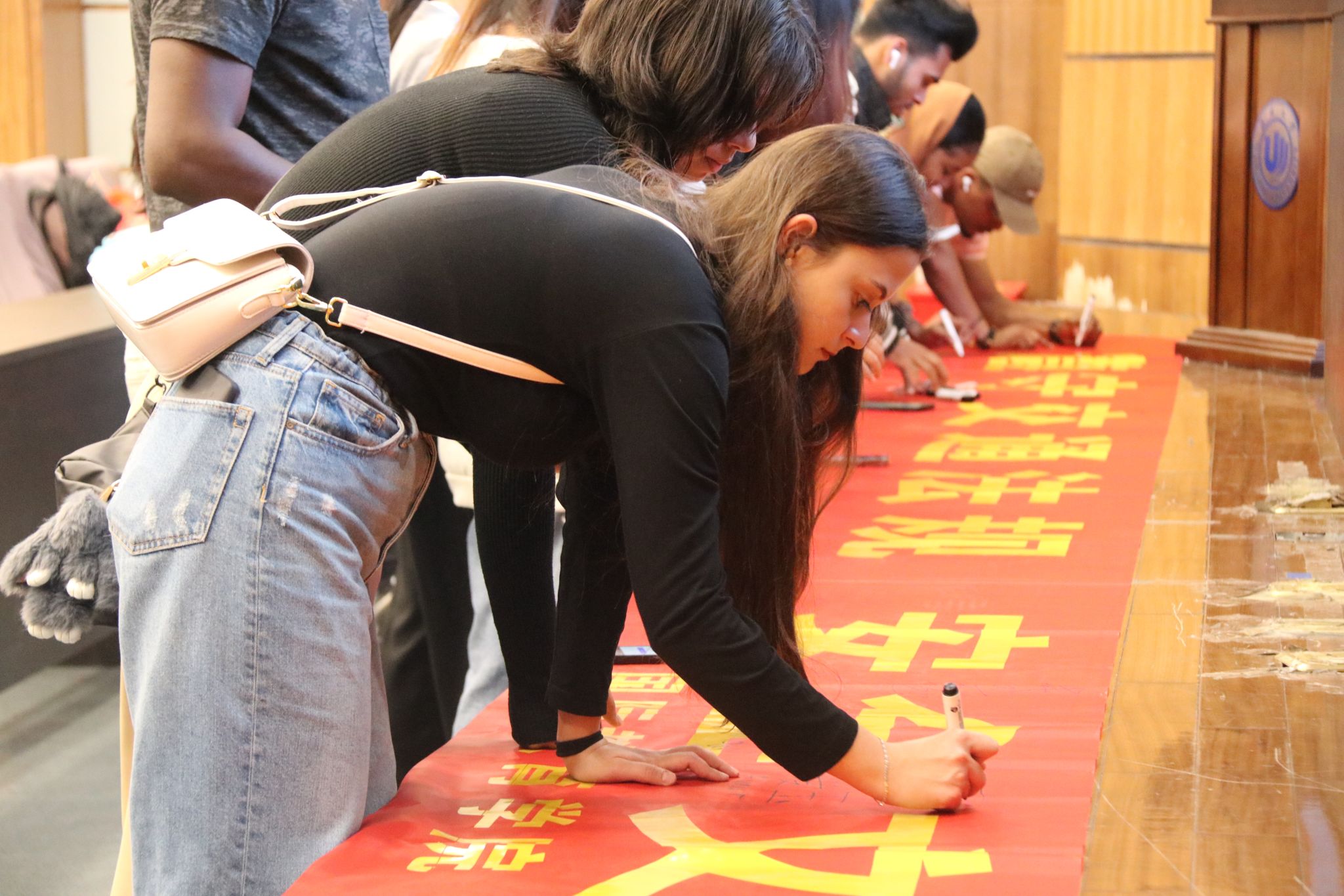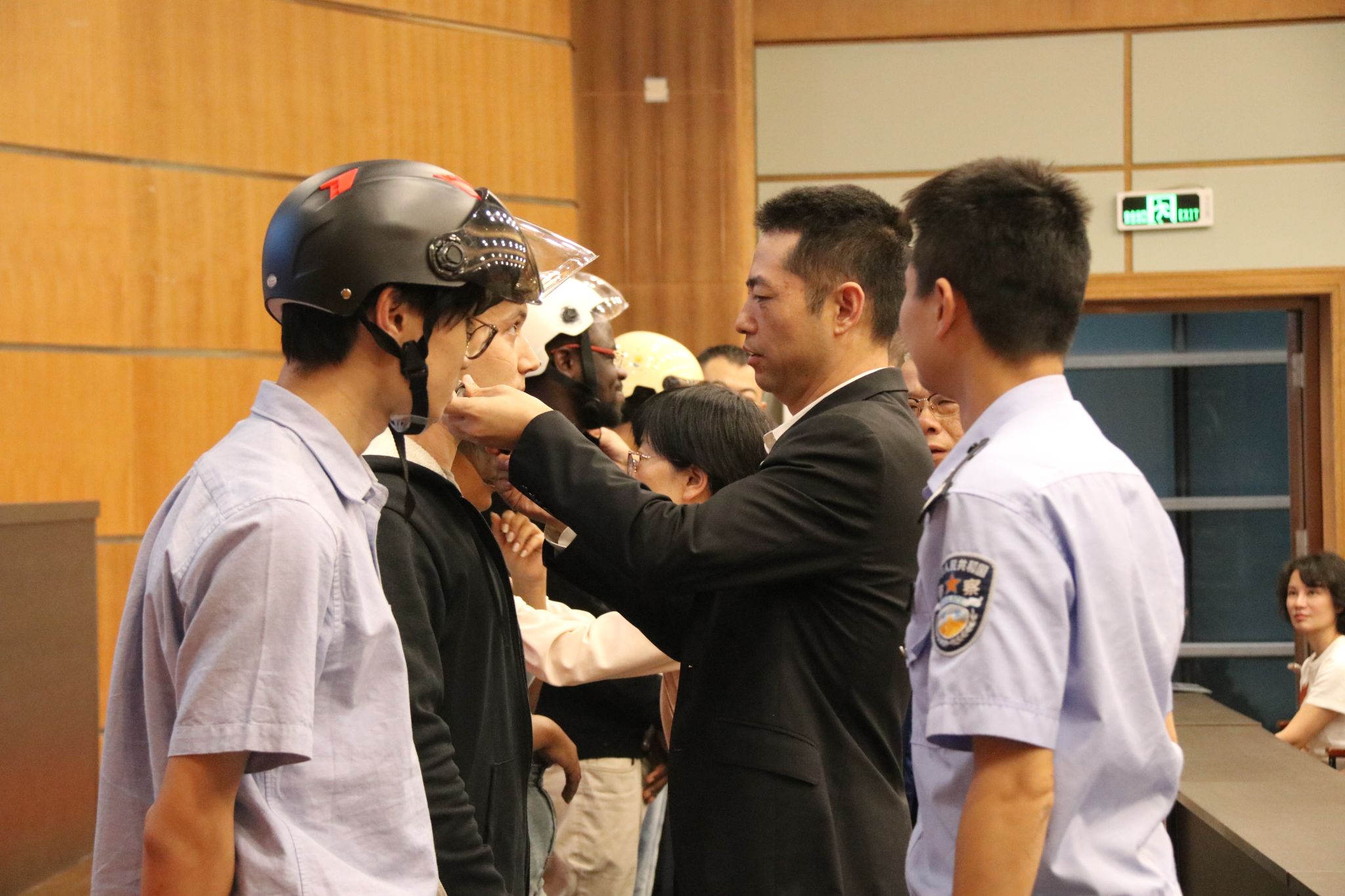 大会现场还特别设置了安全佩戴头盔及“遵守交通法规 安全文明出行”签名活动。领导、嘉宾现场指导国际学生代表正确佩戴头盔,以实际行动引导国际学生养成遵守交通规则、重视安全防护的良好习惯。国际学生们纷纷在写有 “遵守交通法规 安全文明出行” 的横幅上庄重地签下自己的名字,每一笔都蕴含着他们对交通安全的郑重承诺和积极参与校园安全建设的热情。