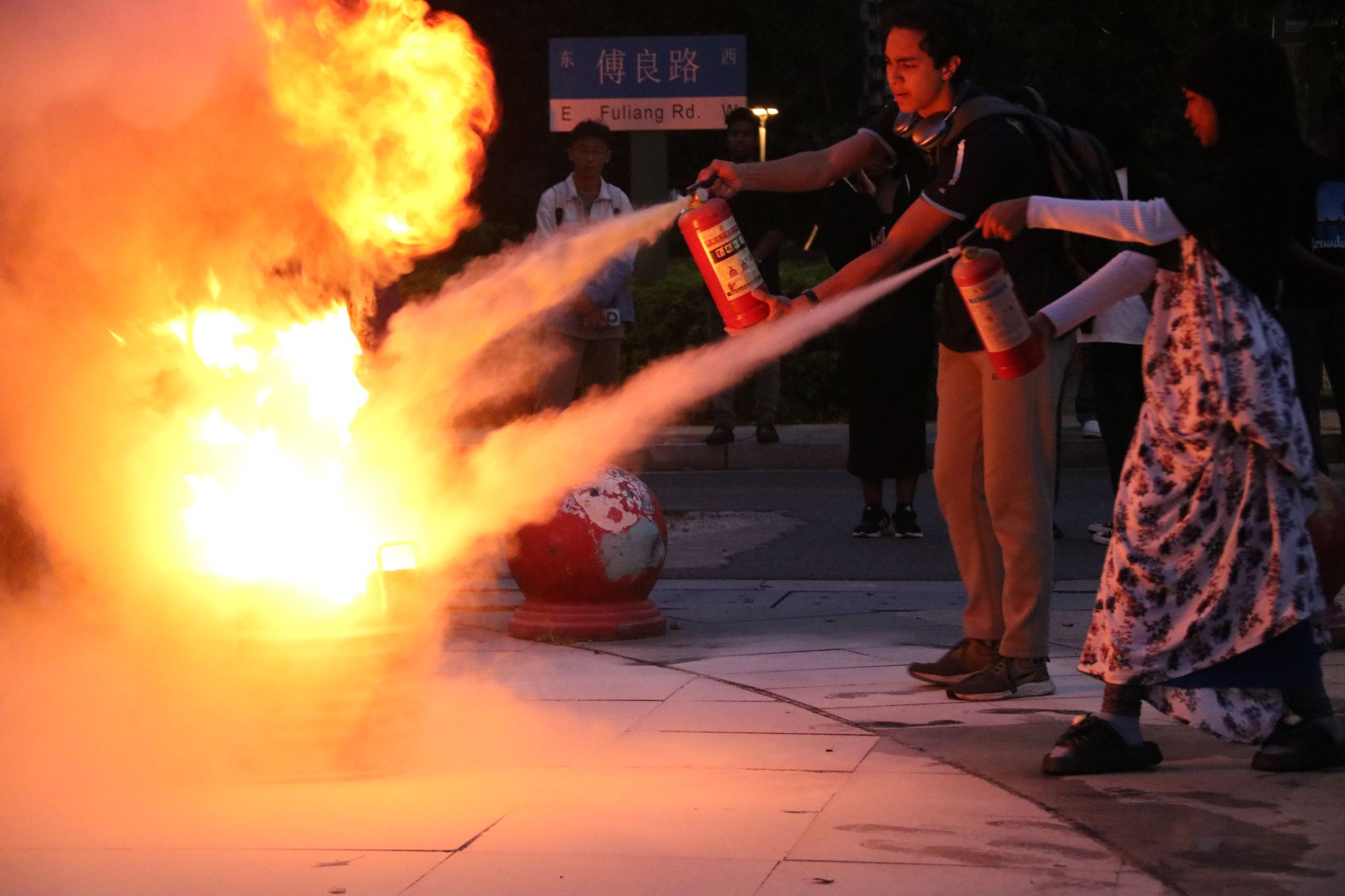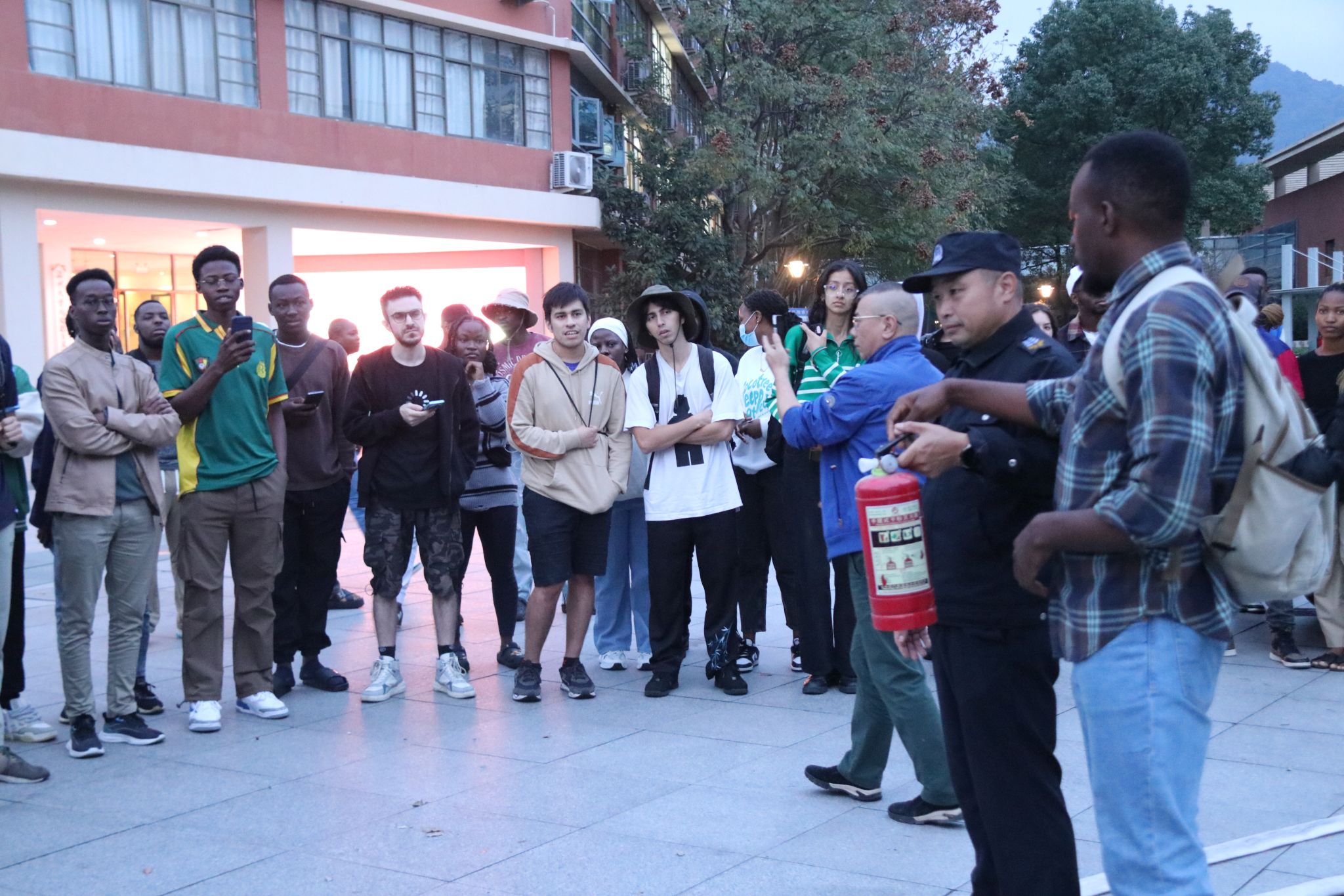 最后是消防逃生演习环节。在学校专业人员的指导下,国际学生们学习了如何使用灭火器以及在火灾发生时迅速而有序地撤离。通过模拟火灾现场,学生们亲身体验了使用灭火器及紧急疏散的过程,这不仅提高了他们的消防安全意识,也增强了他们在紧急情况下的自救能力。