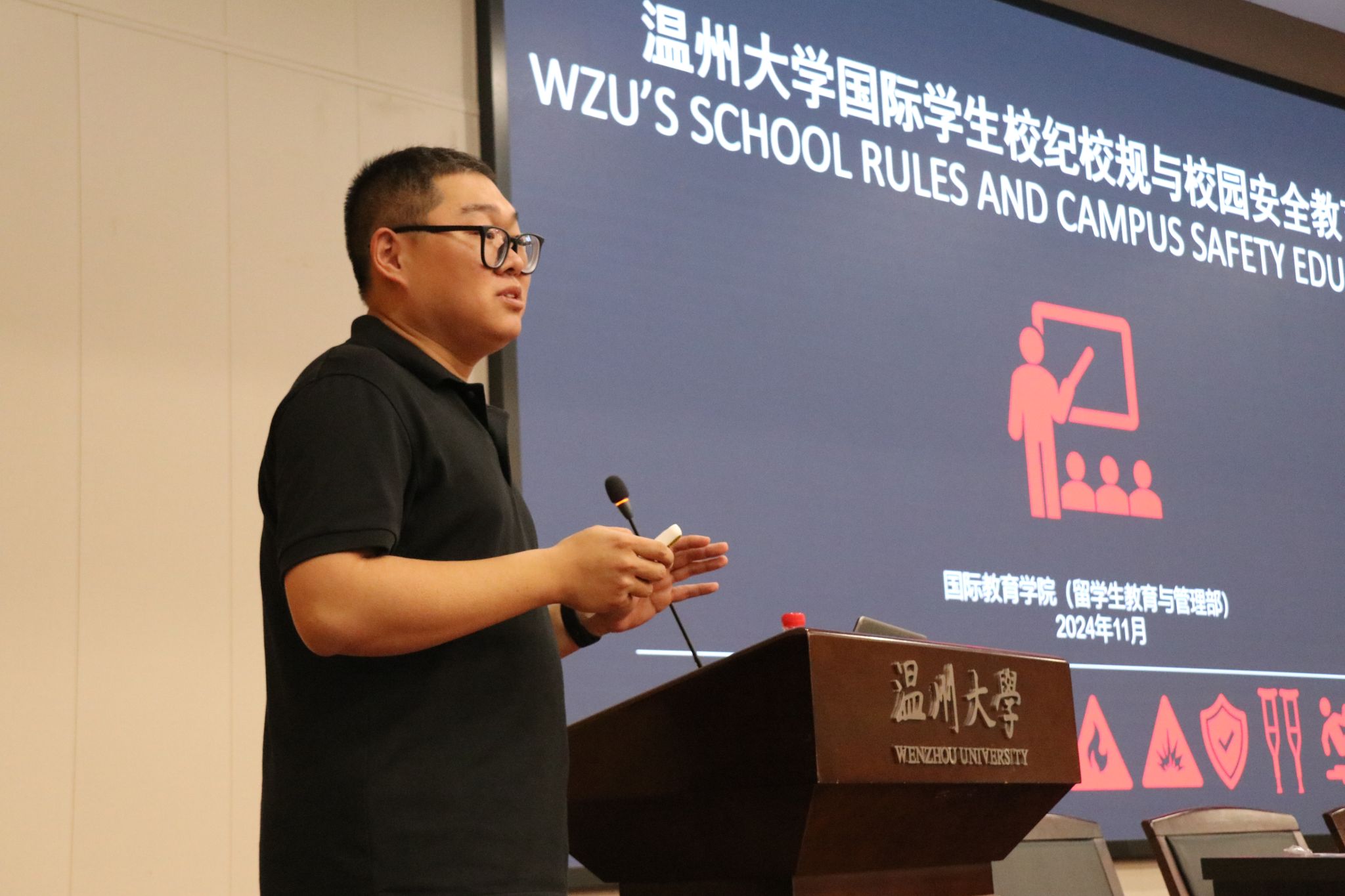 随后,温州市交警四大队八中队副中队长邱强楠以 “最贵的一分钟” 为主题,开启了一场别开生面且极具教育意义的交通安全宣讲活动。他通过播放部分交通事故视频片段,那些惊心动魄的瞬间,让现场学生深刻领悟到这 “最贵的一分钟” 背后所蕴含的沉重代价。他结合实际案例强调遵守交通安全的重要性,并向国际学生传递交通安全知识,做到安全出行、文明出行,让交通安全意识真正入脑、入心。