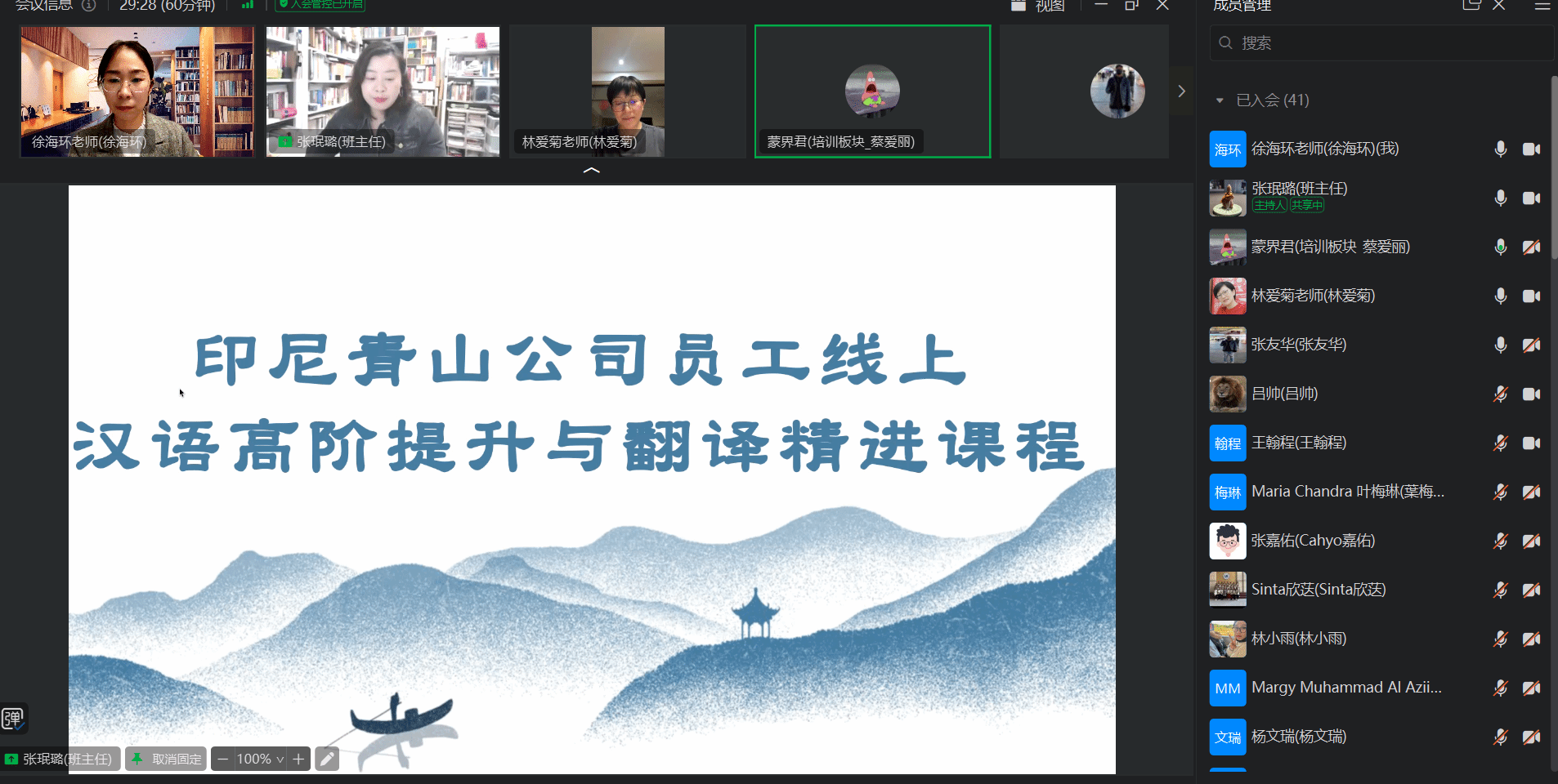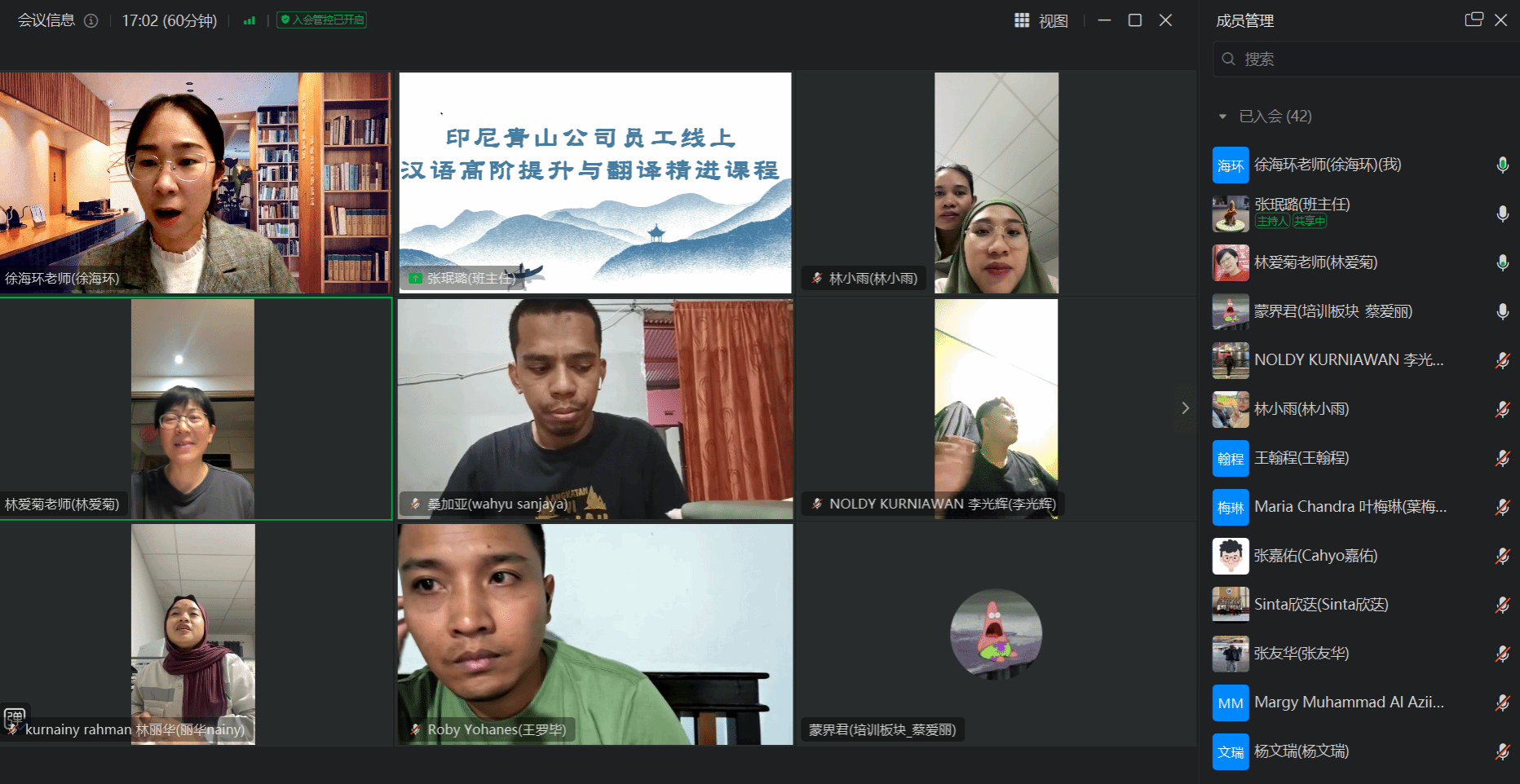 为助力印尼青山公司员工提升汉语水平,搭建高效的线上汉语课程平台,4月10日晚,由3044am永利集团3044noc与印尼青山公司联合打造的 “线上汉语高阶提升与专业翻译精进课程”正式开班。此次合作是双方在多期 “中文 + 职业” 培训项目基础上的进一步深化,旨在满足印尼青山员工日益增长的汉语学习需求,为企业的国际化发展提供强有力的语言支持。