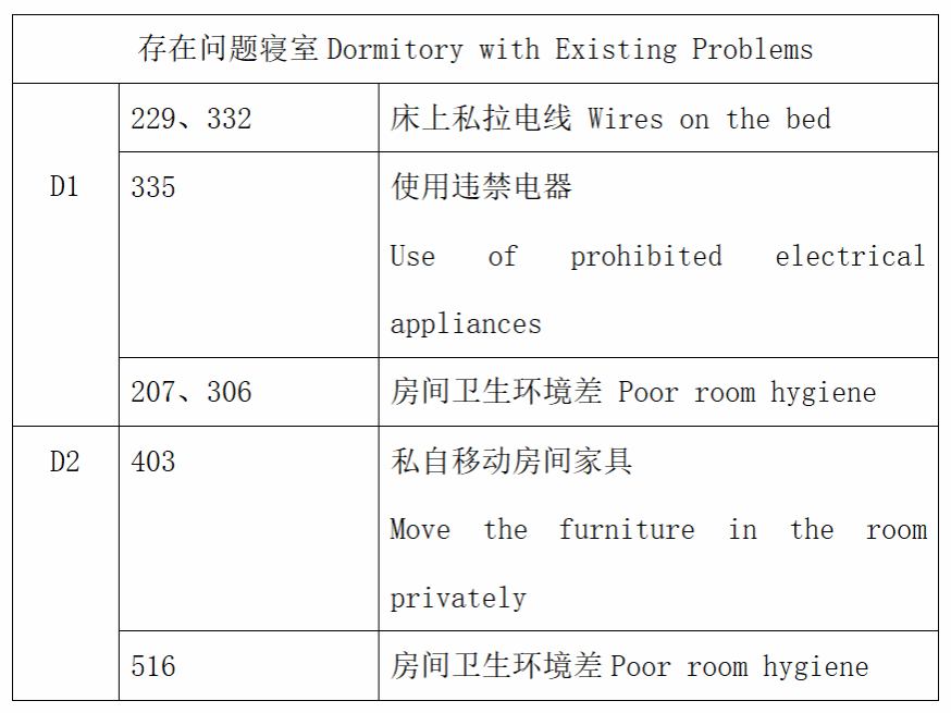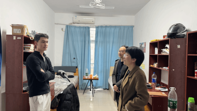 In order to further enhance students' awareness of safety precautions and gain an in-depth understanding of students' daily life and study situations in the dormitory, on the afternoon of March 14th, Lin Aiju, Secretary of the Party General Branch of the School of International Education, Ding Qiang, Deputy Secretary of the Party General Branch, and all counselors visited students' dormitories and carried out an inspection activity on dormitory safety and hygiene.