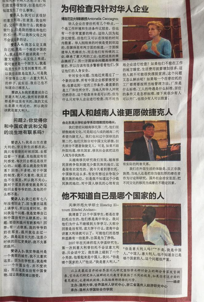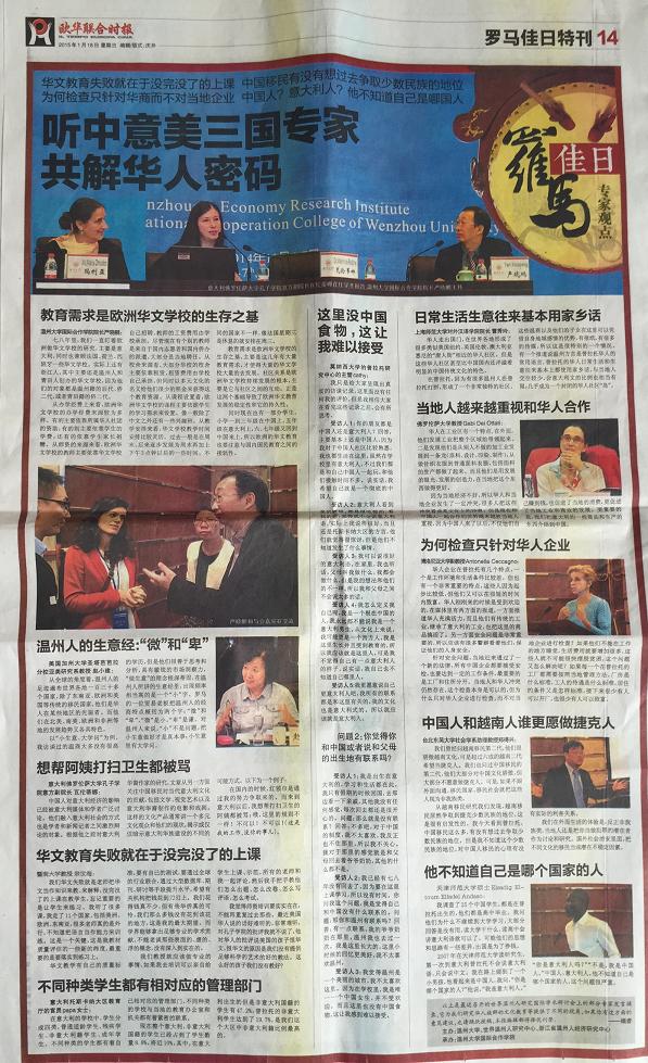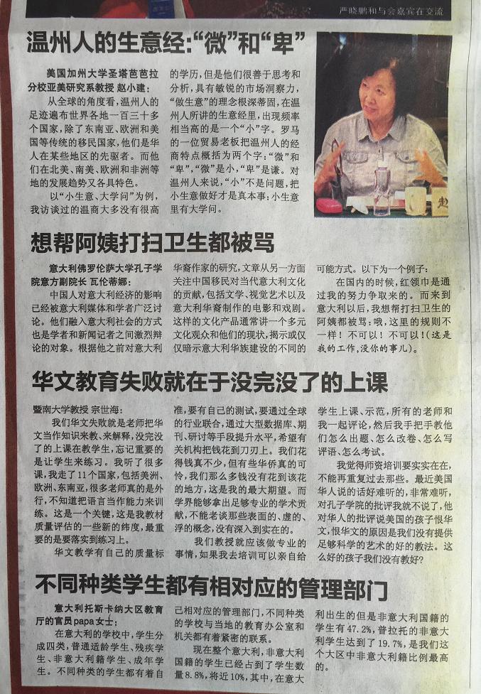 在2015年1月18日出版的意大利第一华文平面媒体《欧华联合时报》上,该报用整版报道了于2014年11月6-7日由温州市世界温州人研究中心、浙江省温州人经济研究中心、3044am永利集团3044noc主办,3044am永利集团3044noc国际合作学院承办的“第五届世界温州人研究国际学术研讨会,尤其关注了本次会议中以“普拉托华侨华人社会变迁研究、华文教育与移民语言传承”为主题的的分论坛。论坛上,来自美国加州大学圣塔芭芭拉分校、意大利博洛尼亚大学、意大利佛罗伦萨大学、日本大阪大学、捷克查理大学、台北东吴大学、锡耶纳外国人大学、暨南大学、浙江大学、上海外国语大学、上海师范大学、天津师范大学、中国华侨华人历史研究所、宁波大学等海(境)内外高校和科研机构,以及海外中文学校和报社的专家学者、我校华文教育研究所的多位老师济济一堂,海内外学者畅所欲言,从多学科出发,全方位、多层次地挖掘和提炼海外温州人社会变迁、华文教育和语言文化传承的发展规律。《欧华联合时报》摘录了其中多位专家的观点: