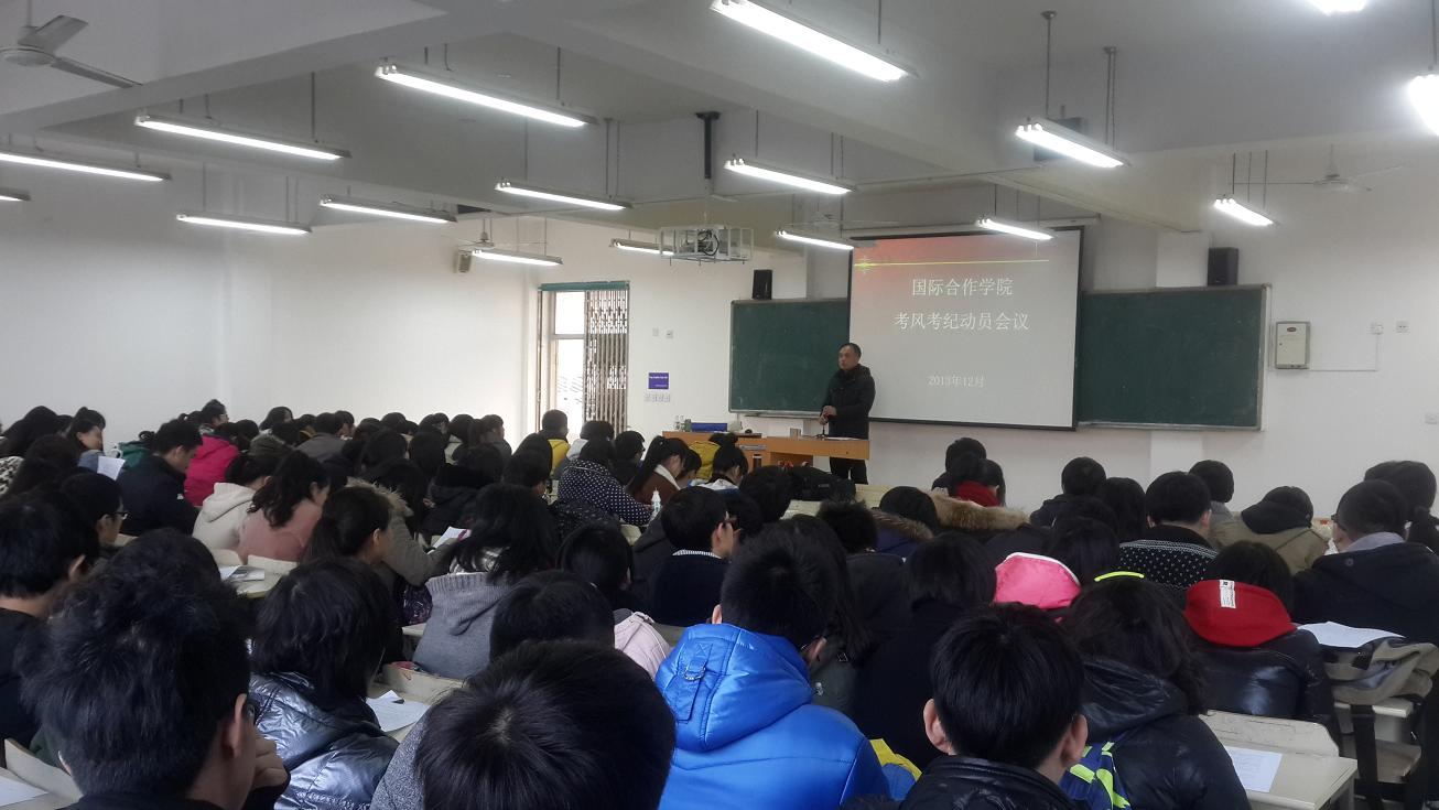 会议开始前,每位同学都收到了一份《国际合作学院学生诚信考试承诺书》,陈赞安老师就承诺书上的条款向同学们进行了解释。接着,他就永利集团官网本学期的学风情况进行了通报,指出虽然永利集团官网学风情况良好,但仍然有少部分同学存在迟到、上课玩手机的不良习惯。他重申了《国际合作学院关于请假手续、考勤制度的实施办法》,要求纪律委员和学生会加强办法的执行力度,并对本学期违反相关规定的同学进行了严肃批评。朱建平书记结合《学生手册》相关规定,引用了数个考场违纪案例,向同学们强调三点:一是从思想上充分重视期末考试,合理安排复习时间,提高学习效率;二是诚信应考,严格遵守考场纪律,杜绝一切作弊行为以及帮助别人作弊的行为,做到期末考试零违纪;三是在复习期间要注意劳逸结合,保证身体健康,在期末考试中发挥正常水平。此外,他还就假期返乡向同学们强调了人财物的安全事宜。