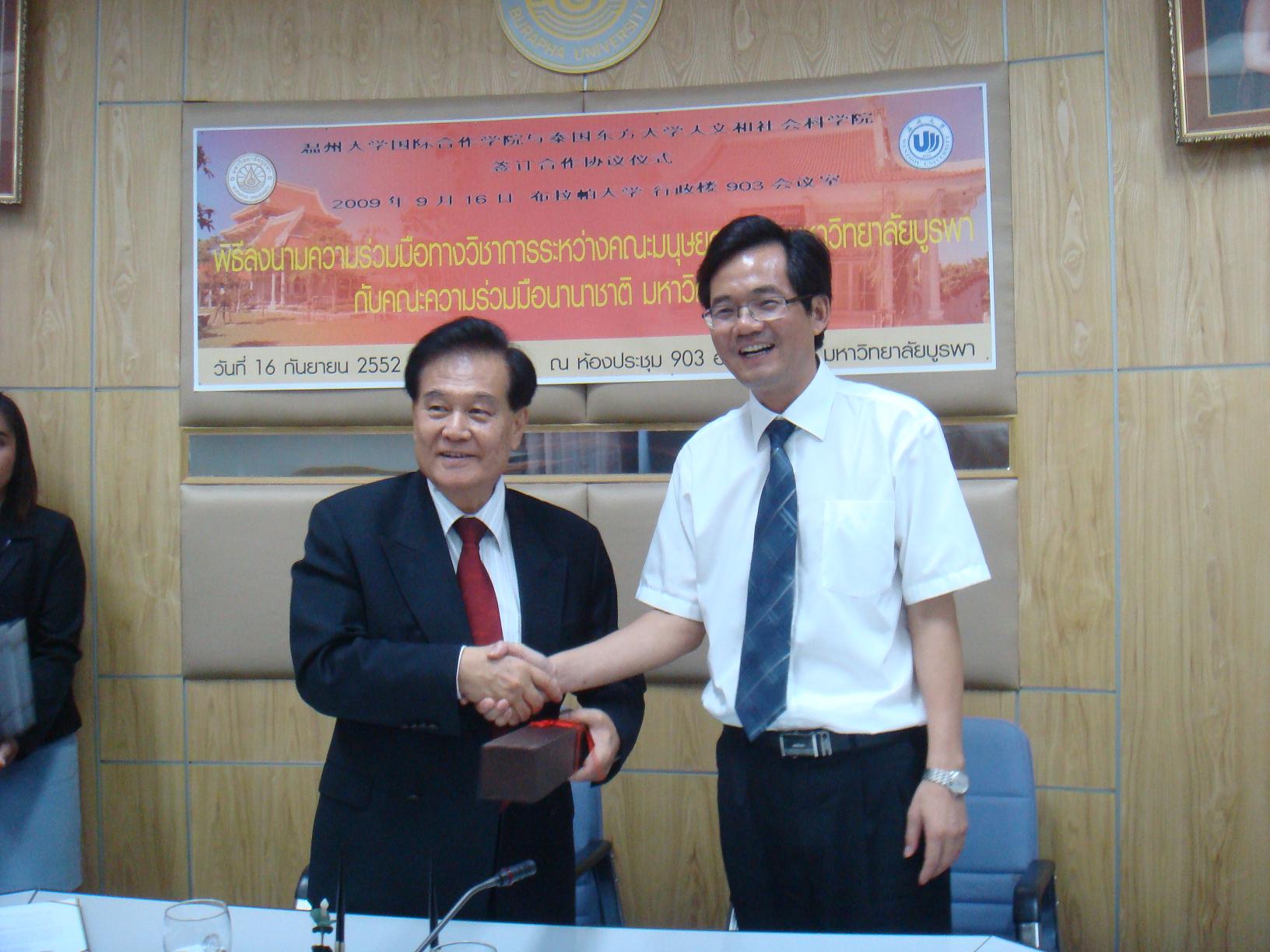 图为2009年9月,蔡袁强校长与时任东方大学校长Suchart Upatham签署《3044am永利集团3044noc与泰国东方大学合作培养教育项目协议书》后握手共贺
