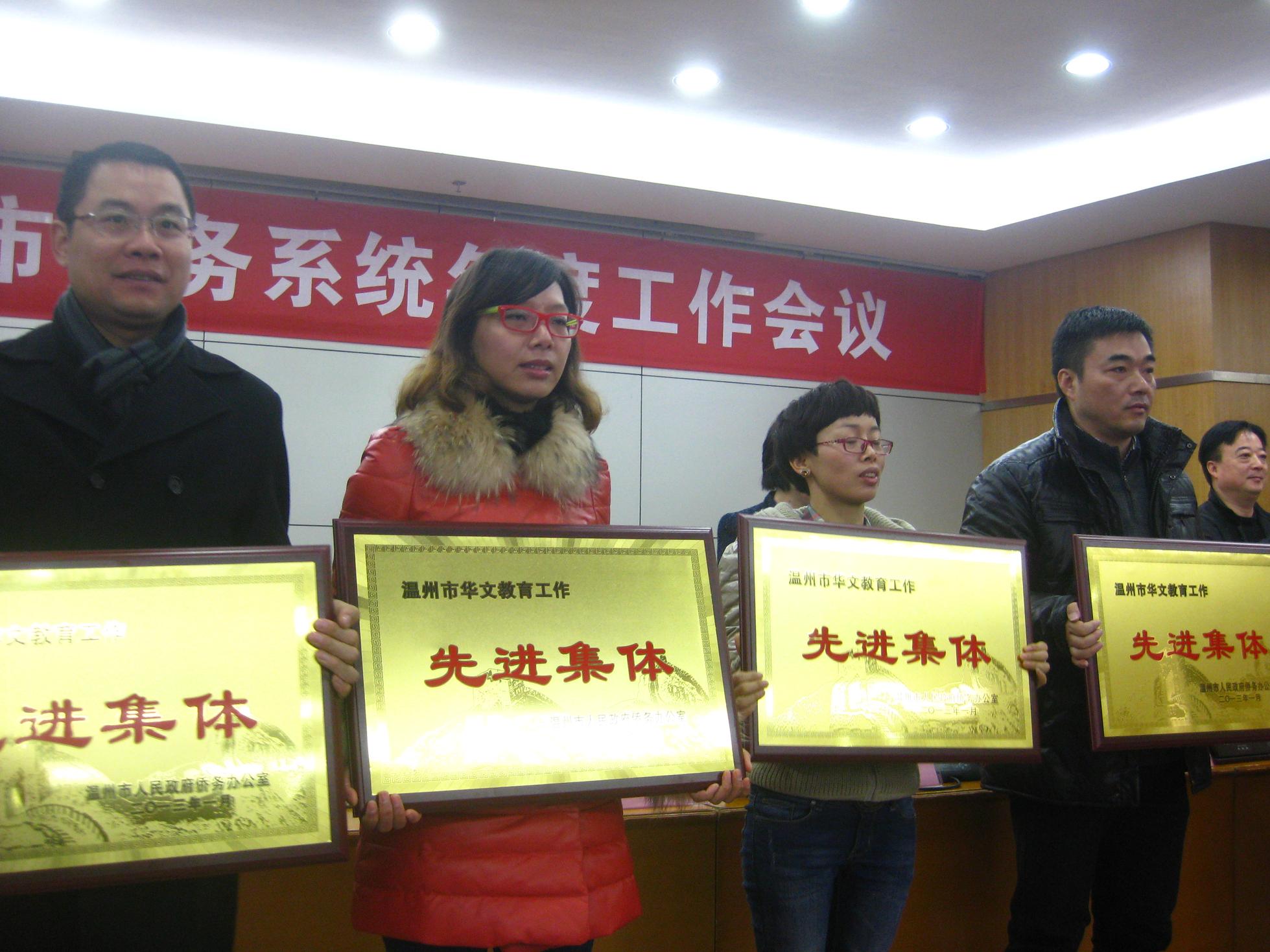 1月8日上午,温州市人民政府侨务办公室召开侨务系统年度工作会议,会议表彰了2012年度全市侨办系统先进单位(集体)和先进个人。我校荣获“温州市华文教育工作先进集体”称号,永利集团官网包含丽老师荣获“温州市华文教育工作先进个人”称号,接受了表彰和授牌。