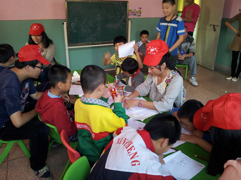 活动在一片欢笑声中开始,志愿者们在尽心教授的同时,也与这些可爱的孩子们交流心声,尝试走进他们同样丰富多彩的的内心深处。第一组志愿者先在黑板上写下歌词,然后一字一句地教孩子们唱歌,并玩了击鼓传花的游戏。第二组和第三组分别教孩子们学写字和画画,孩子们在纸上画下梦想中的世界,他们画得栩栩如生,丝毫不比正常的孩子差,有的孩子还问了志愿者们的名字,并认真地在纸上用笔记录下来。志愿者们欣喜地看到了多次活动以来,这群特殊的孩子们都有了进步,有的已经活跃了很多,能画更美的画,也认识了更多的字。