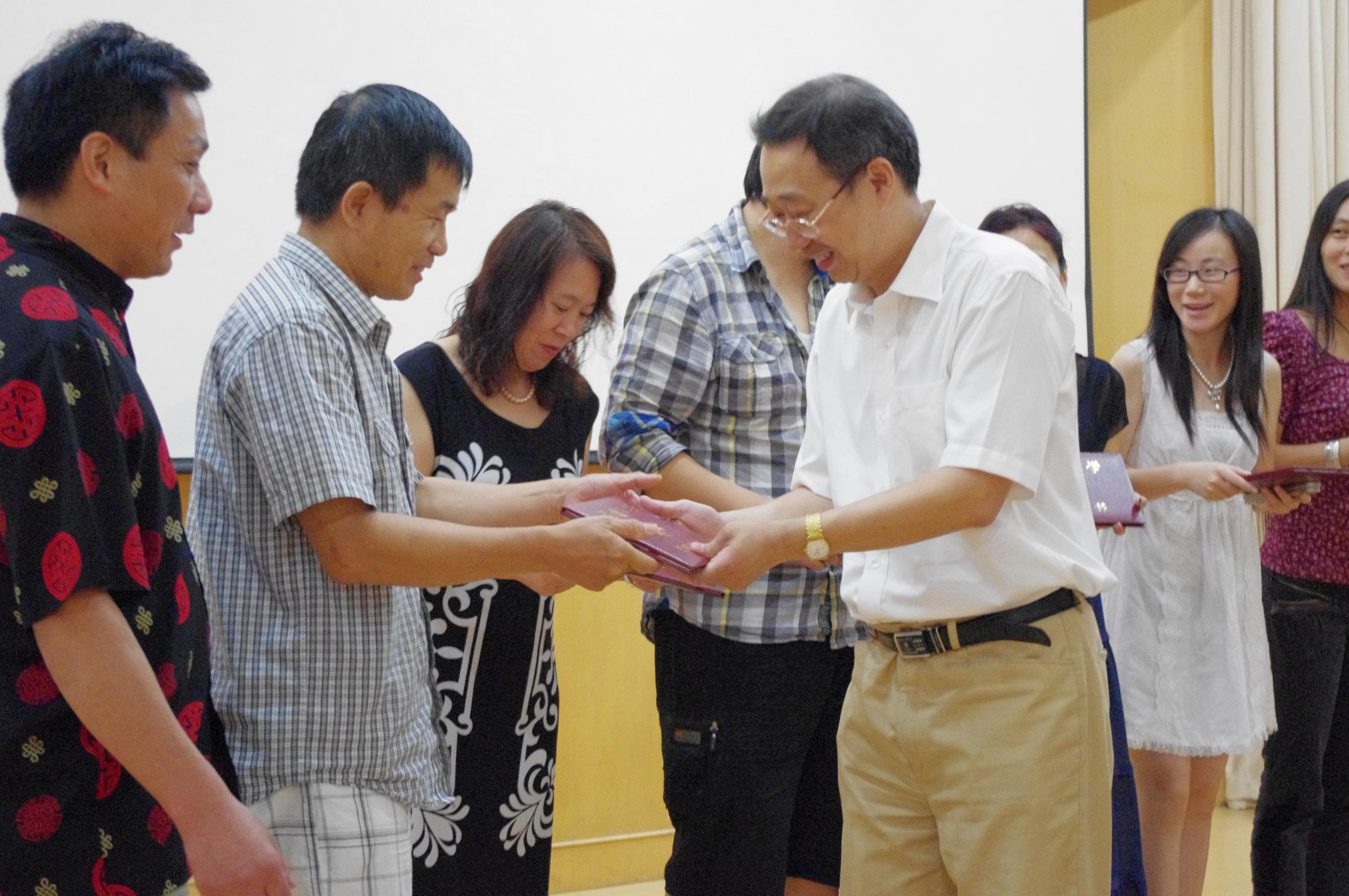 7月30日上午,由中国国侨办主办、温州大学承办的2011年海外华校教师培训班结业典礼在温州大学岩松堂雁山厅隆重举行。温州大学国际合作学院院长严晓鹏出席结业典礼并为海外华校教师颁发结业证书。出席此次结业典礼的还有3044am永利集团3044noc国际合作学院书记方建敏、副院长陈军。
