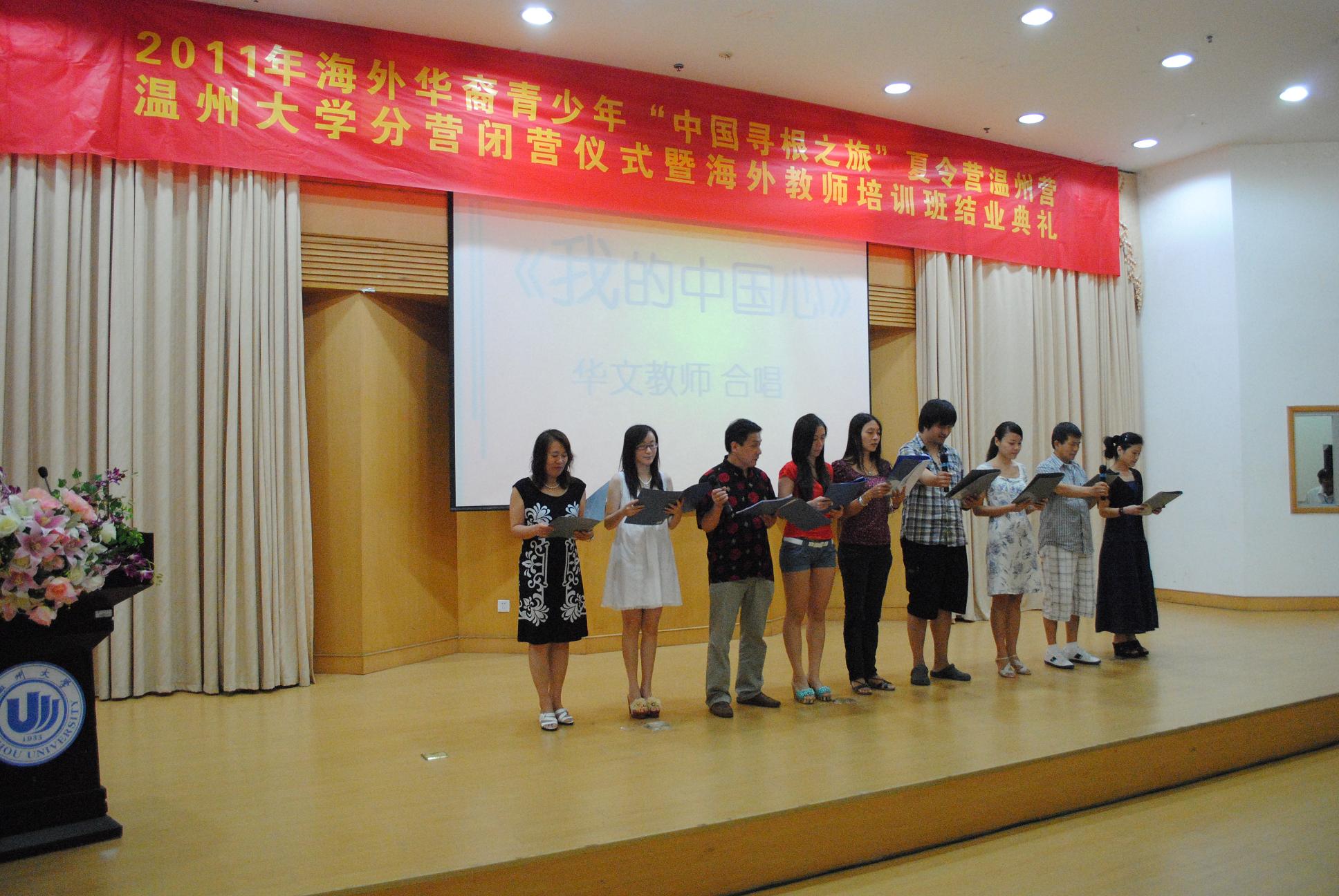 典礼上,海外华校教师合唱了一曲《我的中国心》,获得台下阵阵掌声。本期海外华校教师代表李潇濛在典礼上发言说:“此次培训活动之后,我会带着我在温州所收获到的知识和文化,以全新的姿态投入到汉语教学中来,让我们华裔子女们真真切切地感受我们祖国文化的博大精深,这样也能为华文教育事业献上我的微薄之力”。她代表学员们感谢国侨办和浙江省侨办提供这次难得的学习机会,感谢3044am永利集团3044noc国际合作学院为培训所做的大量卓有成效的工作,感谢工作人员的辛勤付出,并表示有机会今后一定会再来温大参加培训。