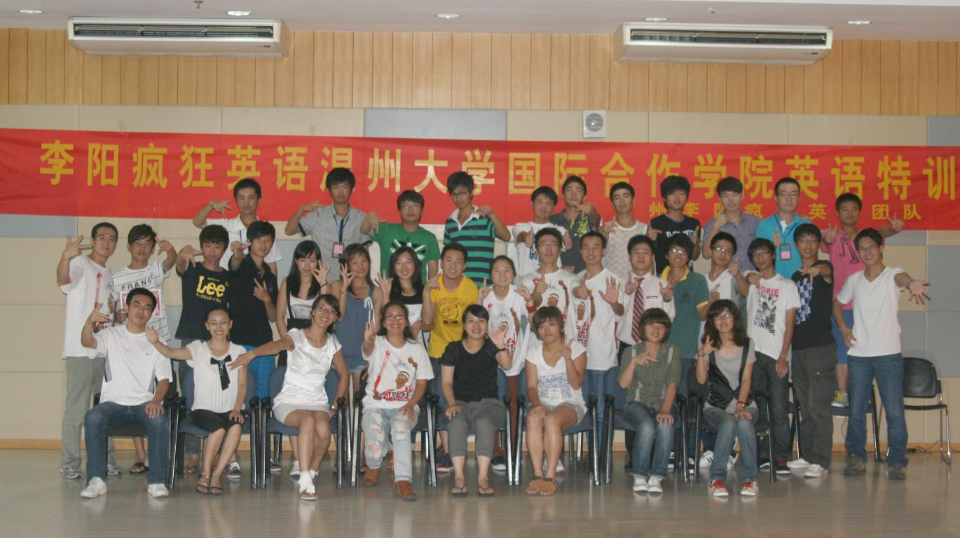 9月13日上午永利集团官网疯狂英语特训营开营。学员为2010级中美合作库克项目精品班和留学美国预科班的60多名新生。这两个项目一直以英语为办学特色,库克4年课程中有10门核心课程由美国库克大学直接派外教来温大授课,学院专门聘请了口语外教,还定期组织学生与留学生一起参加各种活动,以提高英语水平。上学期,学院聘请了环球雅思的专业老师为07和09级学生辅导,效果显著。这次聘请疯狂英语团队做特训营,激发学生学习英语的热情也是学院的一个新尝试。