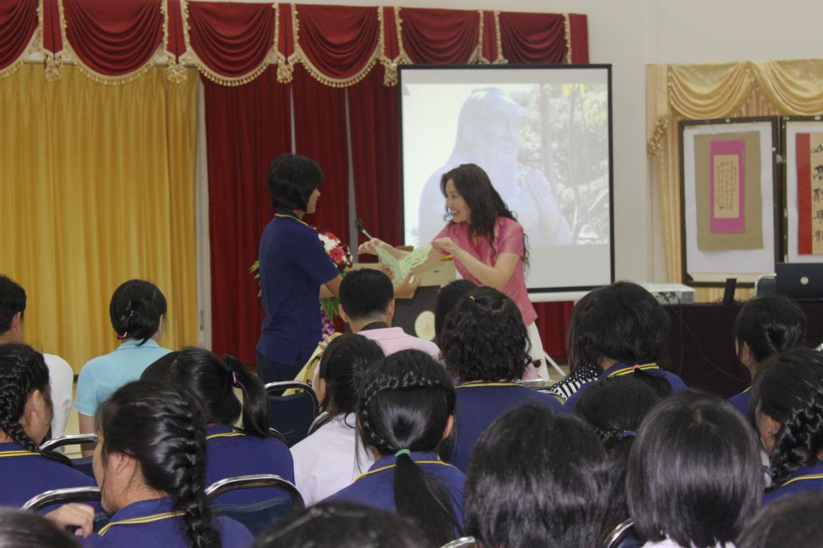 泰方院长符丽珠博士向学生们介绍了孔院设立一年来的发展情况,中方院长丁力博士介绍了中秋佳节的传说和习俗,永利集团官网外派汉语教师张丽丽演奏了中国传统民乐并现场表演中国剪纸,志愿者老师林锦芝和欧阳潭演唱了中文歌曲,上海大学书法家徐步群老师现场进行了书法演示,均受到师生们的热烈欢迎。西亚怒颂中学的同学们也演唱了他们准备的中文歌曲,接受了孔院赠予的小礼物。整个现场中泰师生的互动气氛欢快热烈,大家一边品尝月饼,一边观看表演和展出,感受中国文化的熏陶和浸润,加深了对中国以及中国文化的理解和喜爱。西亚怒颂中学的中文部负责人张亚佳老师说:孔院的文化活动不仅开拓了学生视野,而且提高了学生学习汉语的兴趣和热情。她还表示特别希望能够在汉语教学、HSK汉语水平考试以及中国文化传播等方面与孔院有更多更广泛的合作。本次活动扩大了孔院在泰国东部的影响,使更多的学生了解汉语和中国文化,起到了很好的辐射作用,为孔院工作的进一步开展打下良好的基础。