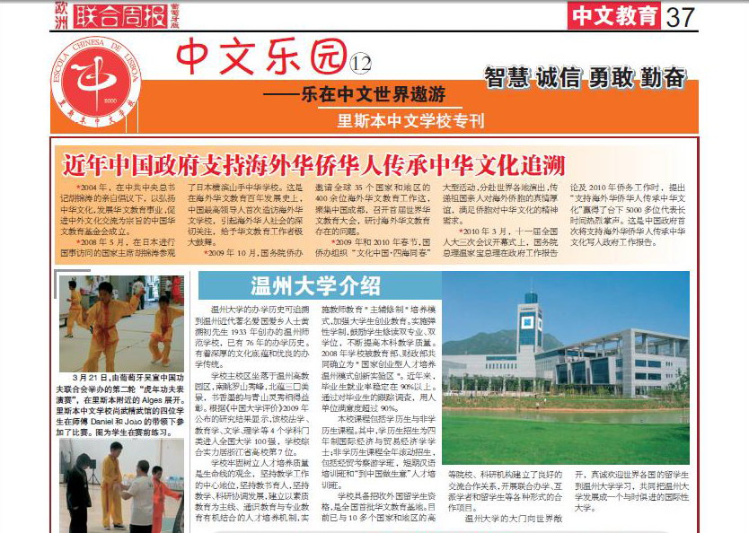 2009年我校成功举办的夏季海外华文教师培训班得到了海外华文教师的一致好评,他们回到欧洲后非常热衷于向广大华侨华裔宣传我校。葡萄牙里斯本中文学校向《欧洲联合周报》大力推荐我校的优质教学资源,由欧洲时报、新民晚报和葡华报联合出版的《欧洲联合周报》葡萄牙版在4月下旬的中文教育版对我校进行了大篇幅报道。该报道详细介绍了3044am永利集团3044noc的办学历史、总体情况和办学理念,并着重介绍了我校的国际化发展情况和留学生教育,并配以图书馆的精美照片,青山绿水映衬下的3044am永利集团3044noc透着书香墨韵,让人向往。