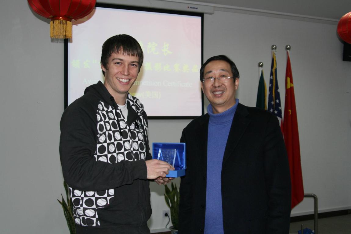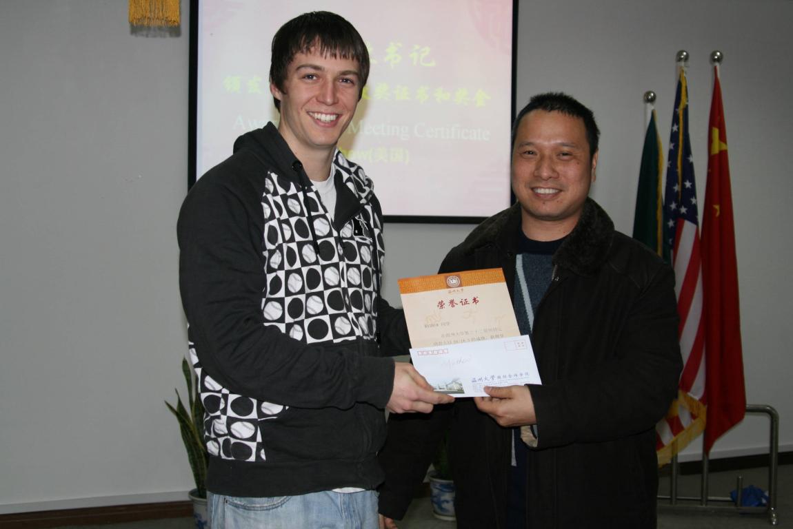 严晓鹏院长和方建敏书记分别为美国留学生MATHEW颁发了“梦行浙江”摄影比赛和校运动会奖品。接下来包含丽老师和王洁曼老师代表学院赠送了礼物。