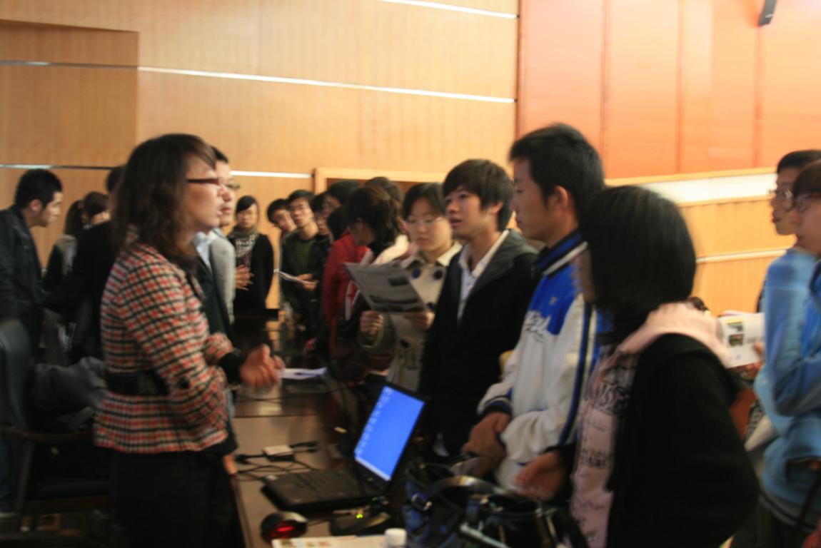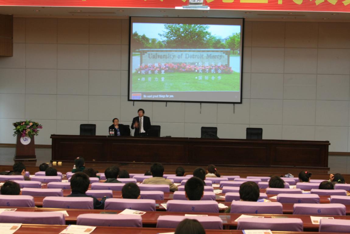 2009年11月16日下午在茶山高教园区3044am永利集团3044noc图书馆二楼报告厅举行了别开生面的留学美国说明会。院长严晓鹏,党委书记方建敏,副院长陈军,对外项目办主任包含丽,美国底特律大学招生主管Louis Lin博士等出席了说明会。说明会由院长严晓鹏主持 。130多名来自3044am永利集团3044noc各学院的同学参加了说明会。此次说明会重点向温大在校生推荐优质美国留学资源,为温大学子搭建低成本高效便捷的就读美国本硕课程的平台。